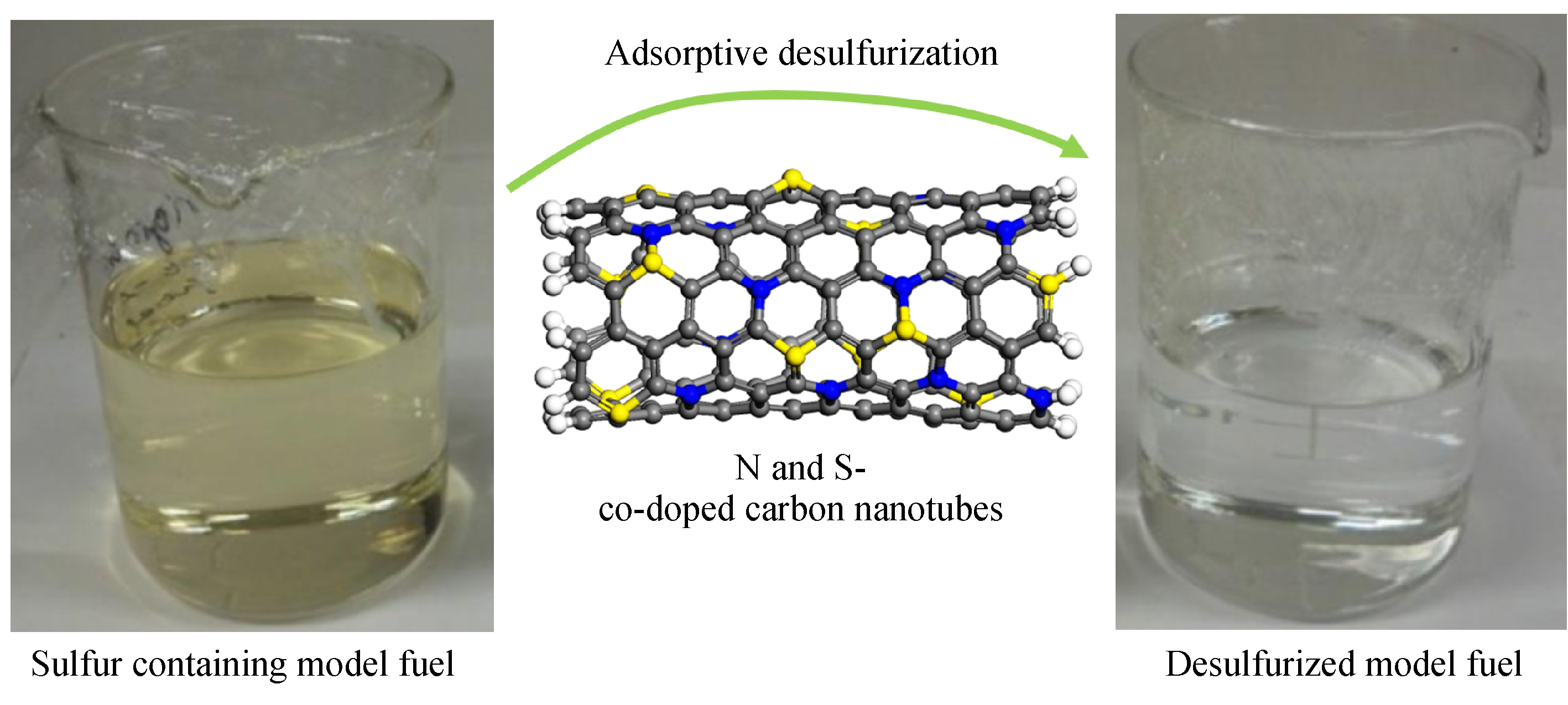 • Synthesis of NS-CNTS is used in a high desulfurization performance. • Synthesizing NS-CNT is considered as a novel adsorbent from low-cost precursors. • A high sulfur removal capacity for NS-CNT is attained compared with recent works.