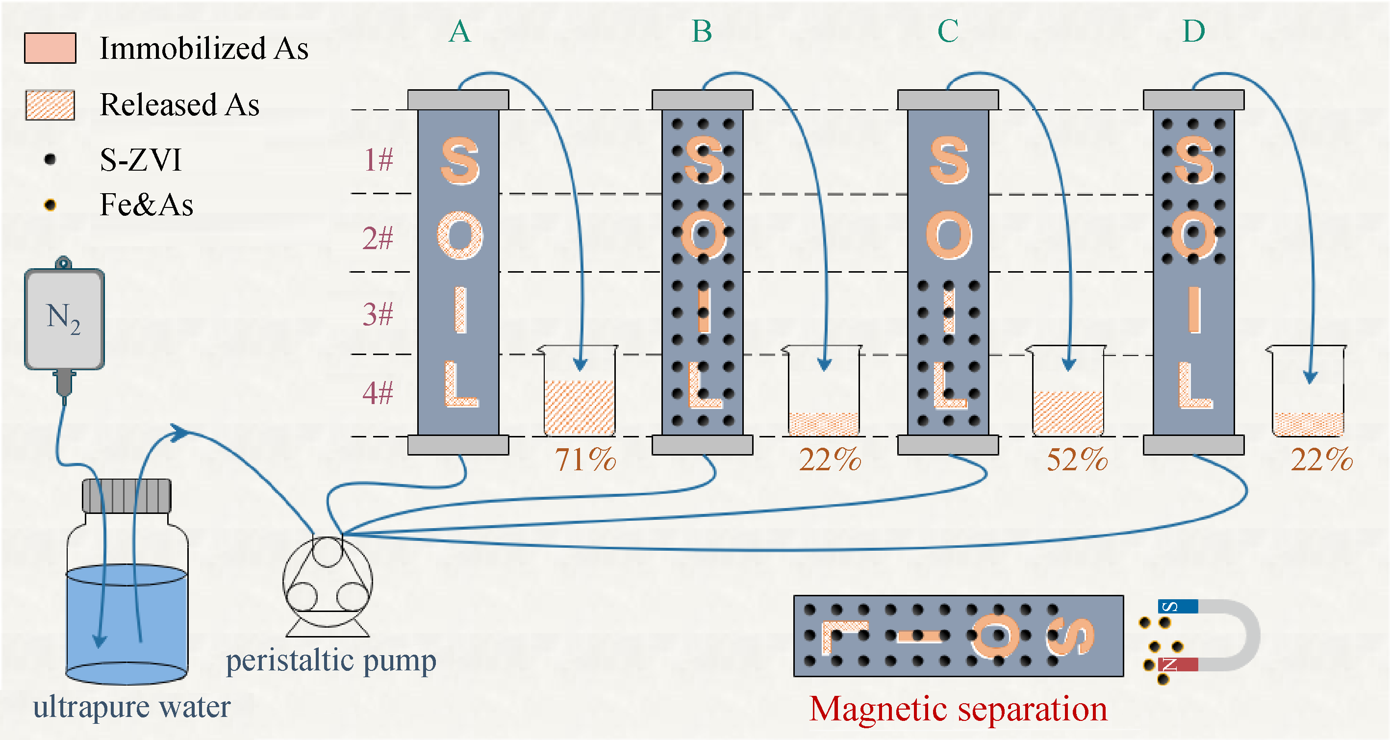 In this study, the influences of sulfidation on zero-valent iron (ZVI) performance toward As(V) immobilization in soil were systemically investigated. It was found that, compared to unamended ZVI, sulfidated ZVI (S-ZVI) is more favorable to immobilize As(V) in soil and promote the conversion of water soluble As to less mobile Fe-Mn bound As. Specifically, under the optimal S/Fe molar ratio of 0.05, almost all of the leached As could be sequestrated by>0.5 wt.% S-ZVI within 3 h. Although the presence of HA could decrease the desorption of As from soil, HA inhibited the reactivity of S-ZVI to a greater extent. Column experiments further proved the feasibility of applying S-ZVI on soil As(V) immobilization. More importantly, to achieve a good As retention performance, S-ZVI should be fully mixed with soil or located on the downstream side of As migration. The test simulating the flooding conditions in rice culture revealed there was also a good long-term stability of soil As(V) after S-ZVI remediation, where only 0.7% of As was desorbed after 30 days of incubation. Magnetic separation was employed to separate the immobilized As(V) from soil after S-ZVI amendment, where the separation efficiency was found to be dependent of the iron dosage, liquid to soil ratio, and reaction time. Toxicity characteristic leaching procedure (TCLP) tests revealed that the leachability of As from soil was significantly reduced after the S-ZVI amendment and magnetic separation treatment. All these findings provided some insights into the remediation of As(V)-polluted soil by ZVI.