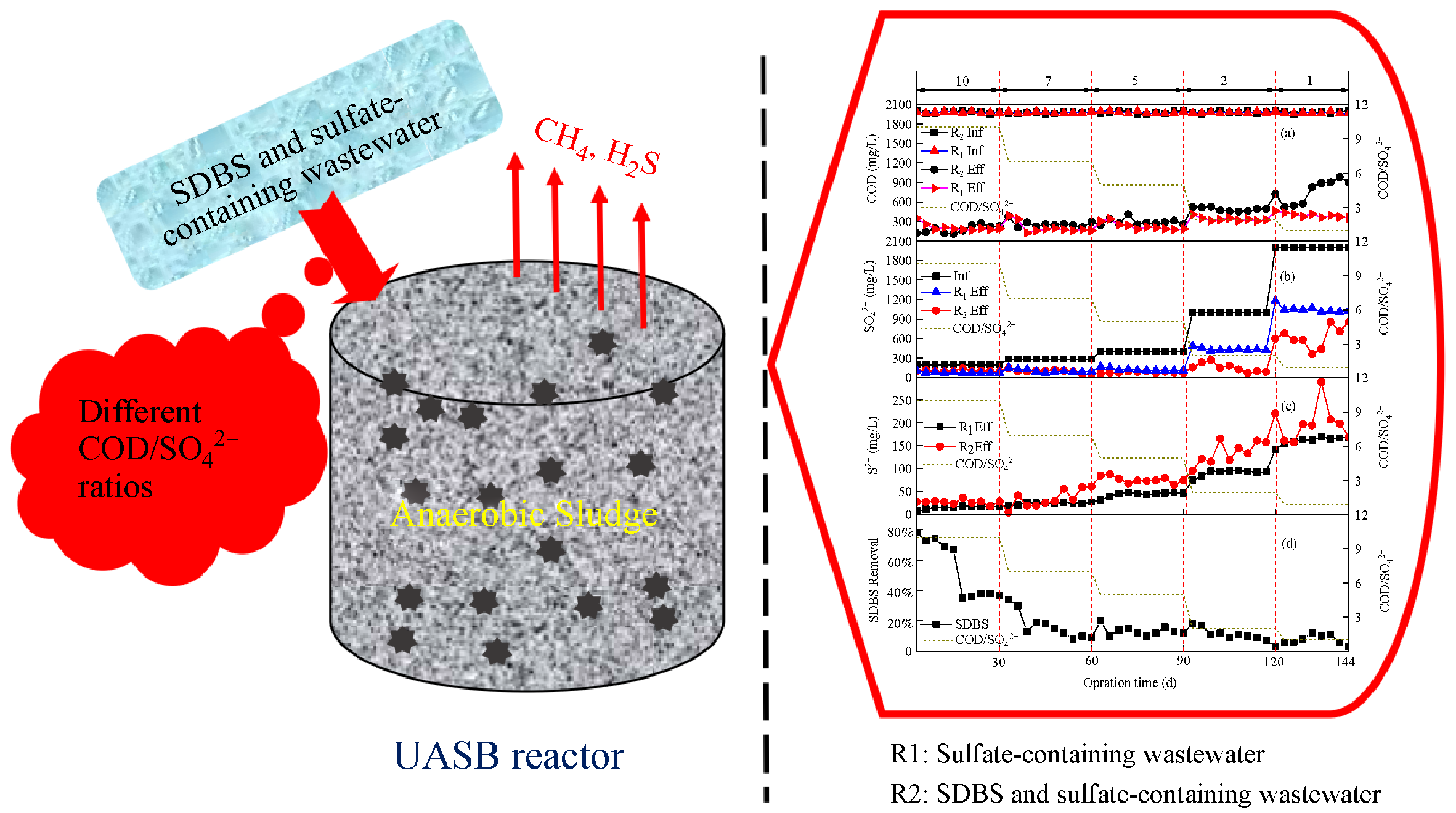 In this study, the effects of organic sulfur on anaerobic biological processes were investigated by operating two up-flow anaerobic sludge blanket (UASB) reactors with sodium dodecylbenzene sulfonate (SDBS) as a representative of organic sulfur. The results indicated that the specific methanogenic activity (SMA) and chemical oxygen demand (COD) removal efficiency of R2 (with SDBS added) were higher than those of R1 (without SDBS) when the COD/SO42− ratio was above 5.0. However, when the COD/SO42− ratio was lower than 5.0, the sulfate reduction efficiency of R2 was higher than that of R1. These results and the observed SDBS transformation efficiency in anaerobic reactors indicate that low concentrations of SDBS accelerate methane production and the continuous accumulation of SDBS does not weaken the reduction of sulfate. Similarly, the calculated electron flux for a COD/SO42− ratio of 1.0 indicates that the utilization intensity of electrons by sulfate-reducing bacteria (SRB) in R2 was 36.48% higher than that of SRB in R1 and exceeded that of methane-producing archaea (MPA) under identical working conditions. Moreover, the addition of SDBS in R2 made sulfidogenesis the dominant reaction at low COD/SO42−, and Methanobacterium and Methanobrevibacter with H2/CO2 as the substrate and Desulfomicrobium were the dominant MPA and SRB, respectively. However, methanogenesis was still the dominant reaction in R1, and Methanosaeta with acetic acid as the substrate and Desulfovibrio were the dominant MPA and SRB, respectively.