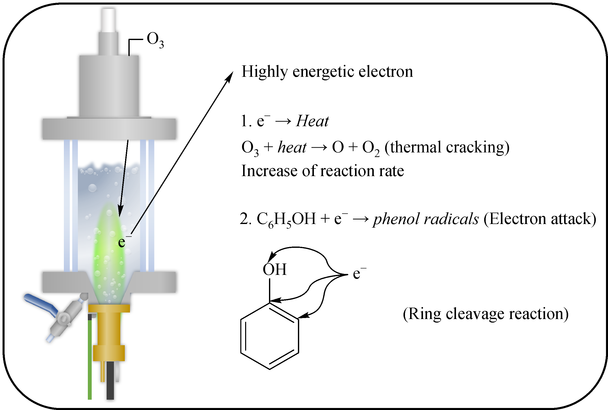 Submerged arc plasma technology was assessed for the removal of phenols from wastewater. The OH radicals generated from the boundary between the plasma and waste solution were considered as a significant factor on the degradation reaction. In this study, the effects of highly energetic electrons released from the submerged arc plasma were mainly studied. The highly energetic electrons directly broke the strong chemical bond and locally increased the reaction temperatures in solution. The effects of the submerged-arc plasma on the decomposition of phenol are discussed in terms of the input energy and initial concentration. The single use of submerged arc plasma easily decomposed the phenol but did not increase the mineralization efficiency. Therefore, the submerged arc plasma, coupled with the ozone injection, was investigated. The submerged arc plasma combined with ozone injection had a synergic effect, which led to significant improvements in mineralization with only a small increase in input energy. The decomposition mechanism of phenol by the submerged arc plasma with the ozone was analyzed.