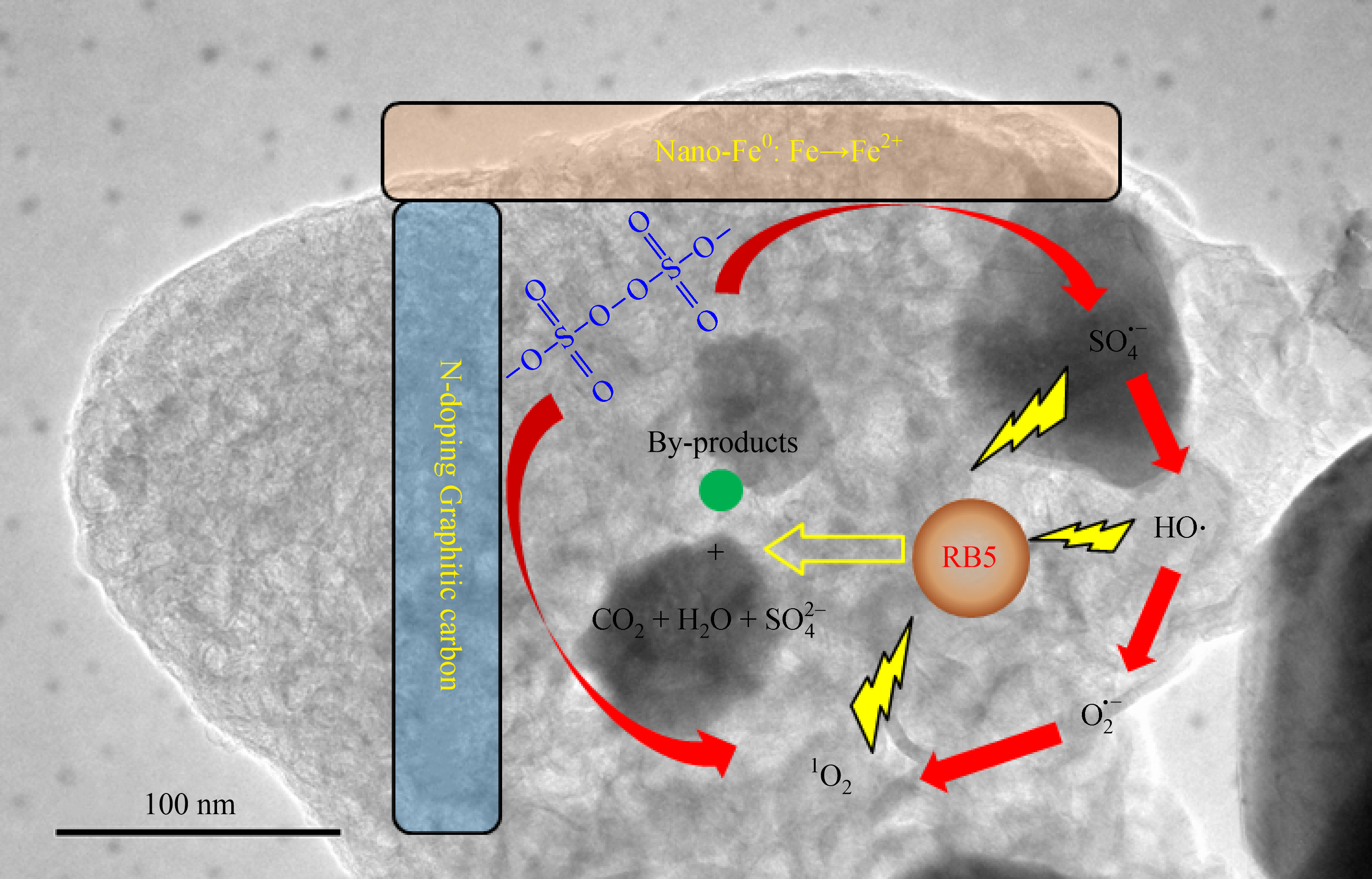 • The MCNZVI is prepared as an interesting material for PS activation. • Graphitized carbon shells facilitate electron transfer from Fe0. • The MCNZVI exhibits excellent performance to degrade RB5 by 1O2. • The MCNZVI has high stability and reusability in the oxidation system.
