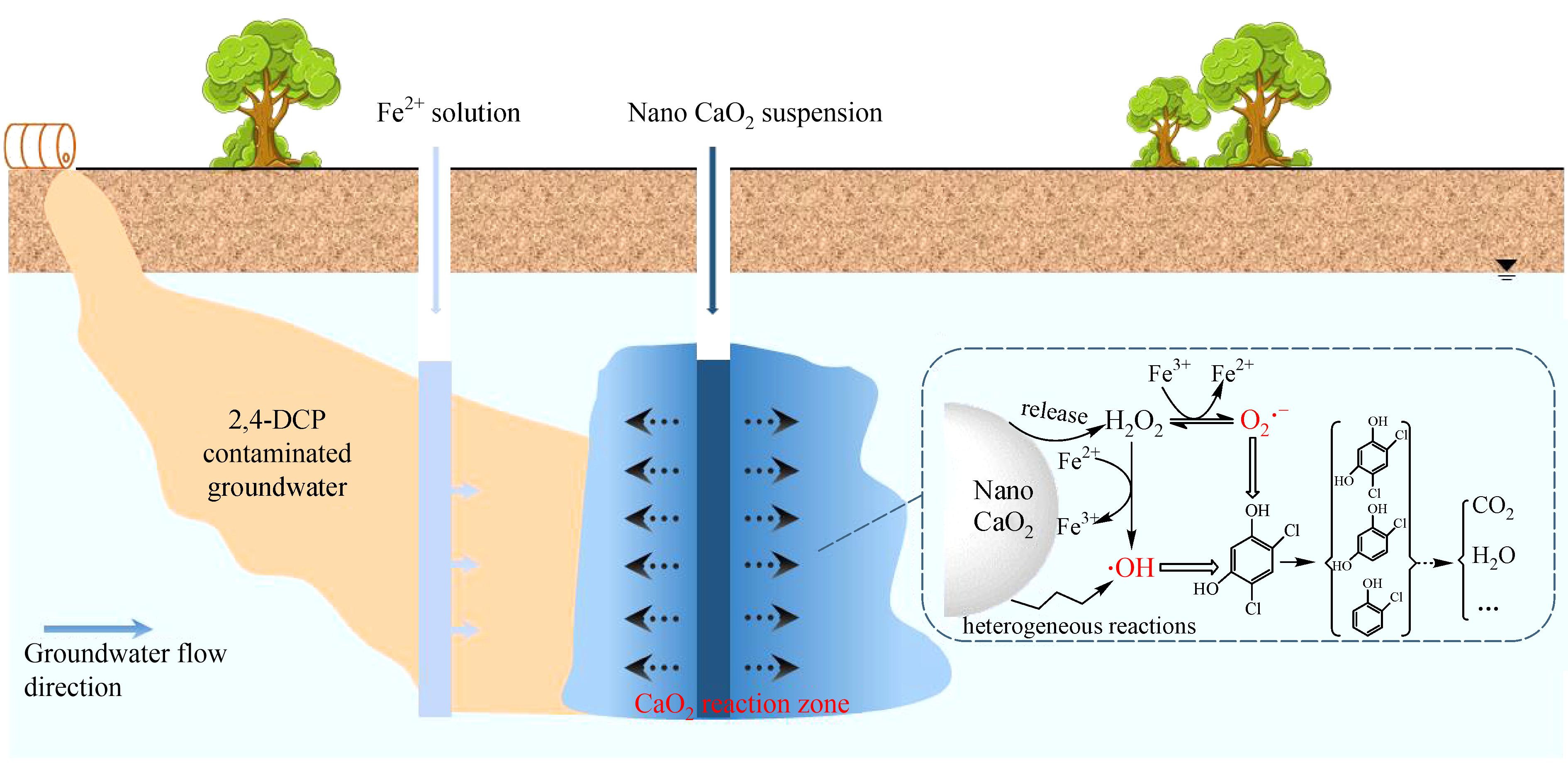 This study evaluates the applicability of nano-sized calcium peroxide (CaO2) as a source of H2O2 to remediate 2,4-dichlorophenol (2,4-DCP) contaminated groundwater via the advanced oxidation process (AOP). First, the effect and mechanism of 2,4-DCP degradation by CaO2 at different Fe concentrations were studied (Fenton reaction). We found that at high Fe concentrations, 2,4-DCP almost completely degrades via primarily the oxidation of •OH within 5 h. At low Fe concentrations, the degradation rate of 2,4-DCP decreased rapidly. The main mechanism was the combined action of •OH and O2•−. Without Fe, the 2,4-DCP degradation reached 13.6% in 213 h, primarily via the heterogeneous reaction on the surface of CaO2. Besides, 2,4-DCP degradation was significantly affected by solution pH. When the solution pH was>10, the degradation was almost completely inhibited. Thus, we adopted a two-dimensional water tank experiment to study the remediation efficiency CaO2 on the water sample. We noticed that the degradation took place mainly in regions of pH<10 (i.e., CaO2 distribution area), both upstream and downstream of the tank. After 28 days of treatment, the average 2,4-DCP degradation level was ≈36.5%. Given the inadequacy of the results, we recommend that groundwater remediation using nano CaO2: (1) a buffer solution should be added to retard the rapid increase in pH, and (2) the nano CaO2 should be injected copiously in batches to reduce CaO2 deposition.