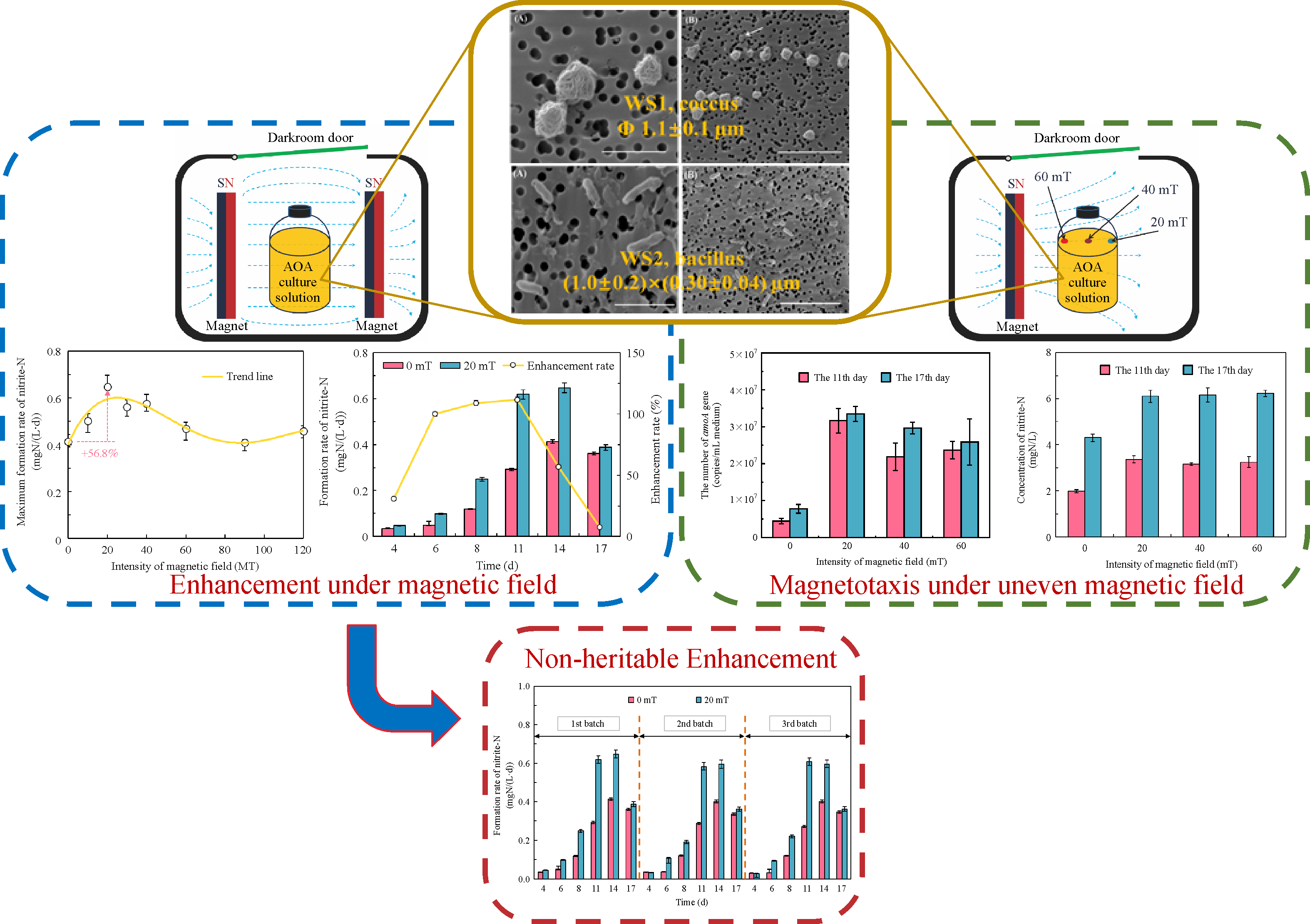 Ammonia-oxidizing archaeon (AOA) could play important roles for nitrogen removal in the bioreactors under conditions such as low pH and low dissolved oxygen. Therefore, enhancing ammonia oxidation capability of AOA has great significance for water and wastewater treatment, especially under conditions like low dissolved oxygen concentration. Utilizing a novel AOA strain SAT1, which was enriched from a wastewater treatment plant by our group, the effect of magnetic field on AOA’s ammonia oxidation capability, its magnetotaxis and heredity were investigated in this study. Compared with control experiment, AOA’s maximum nitrite-N formation rate during the cultivation increased by 56.8% (0.65 mgN/(L·d)) with 20 mT magnetic field. Also, it was testified that AOA possessed a certain magnetotaxis. However, results manifested that the enhancement of AOA’s ammonia oxidation capability was not heritable, that is, lost once the magnetic field was removed. Additionally, the possible mechanism of improving AOA’s ammonia oxidation capability by magnetic field was owing to the promotion of AOA single cells’ growth and fission, rather than the enhancement of their ammonia oxidation rates. The results shed light on the application of AOA and methods to enhance AOA’s ammonia oxidation capability, especially in wastewater treatment processes under certain conditions.