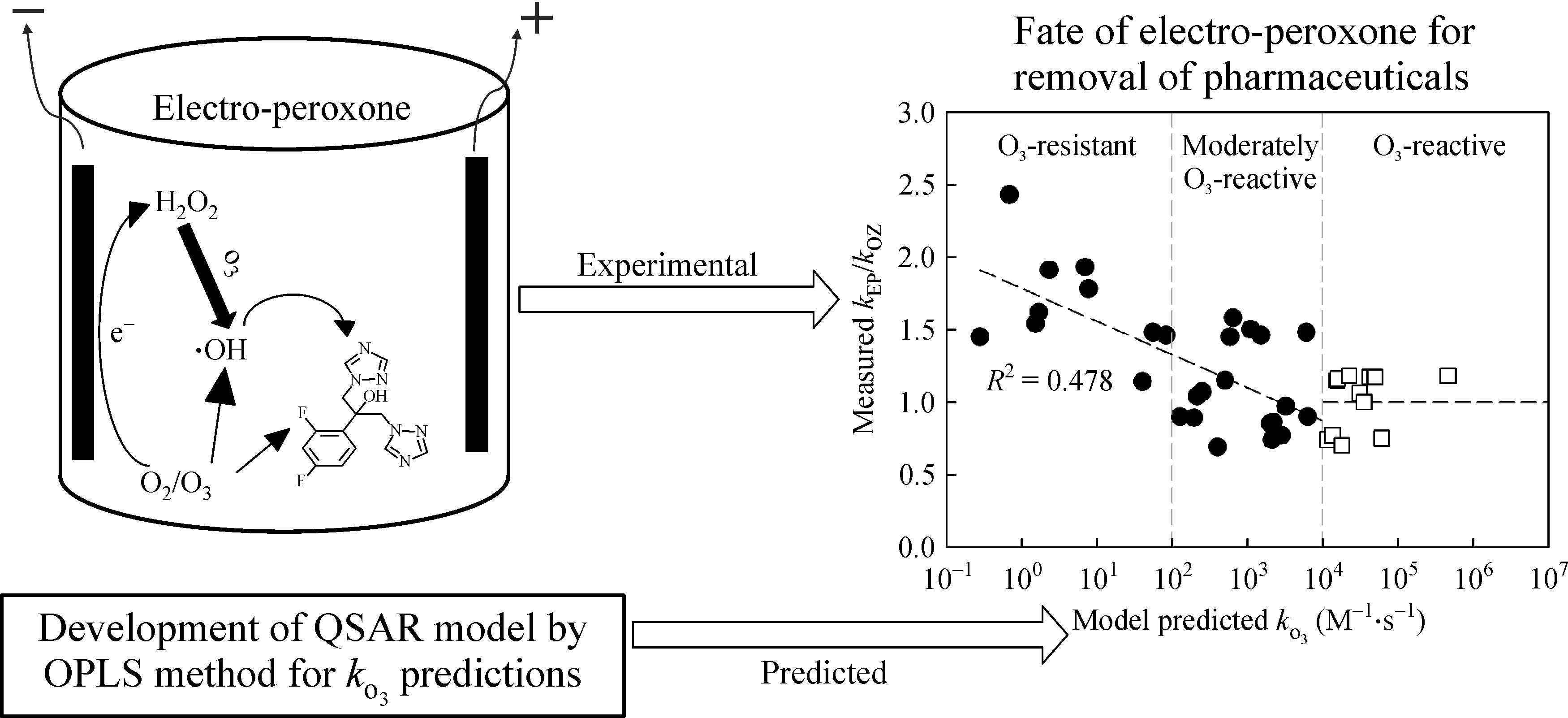 The abatements of 89 pharmaceuticals in secondary effluent by ozonation and the electro-peroxone (E-peroxone) process were investigated. Based on the results, a quantitative structure-activity relationship (QSAR) model was developed to explore relationship between chemical structure of pharmaceuticals and their oxidation rates by ozone. The orthogonal projection to latent structure (OPLS) method was used to identify relevant chemical descriptors of the pharmaceuticals, from large number of descriptors, for model development. The resulting QSAR model, based on 44 molecular descriptors related to the ozone reactivity of the pharmaceuticals, showed high goodness of fit (R2 = 0.963) and predictive power (Q2 = 0.84). After validation, the model was used to predict second-order rate constants of 491 pharmaceuticals of special concern () including the 89 studied experimentally. The predicted values and experimentally determined pseudo-first order rate constants of the pharmaceuticals’ abatement during ozonation (kOZ) and the E-peroxone process (kEP) were then used to assess effects of switching from ozonation to the E-peroxone process on removal of these pharmaceuticals. The results indicate that the E-peroxone process could accelerate the abatement of pharmaceuticals with relatively low ozone reactivity (<~102 M-1·s−1) than ozonation (3–10 min versus 5–20 min). The validated QSAR model predicted 66 pharmaceuticals to be highly O3-resistant. The developed QSAR model may be used to estimate the ozone reactivity of pharmaceuticals of diverse chemistry and thus predict their fate in ozone-based processes.