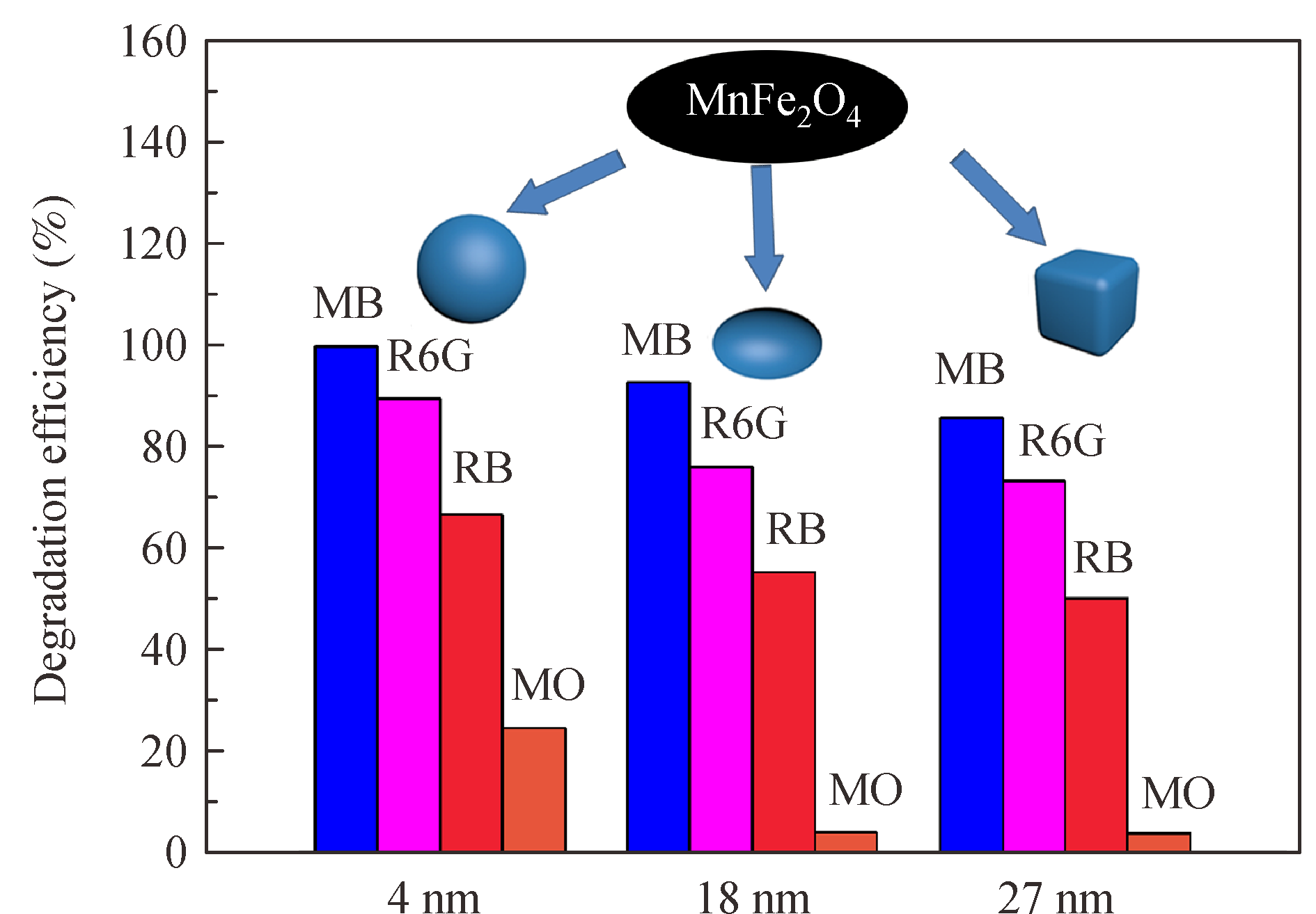 • Size and shape-dependent MnFe2O4 NPs were prepared via a facile method. • Ligand-exchange chemistry was used to prepare the hydrophilic MnFe2O4 NPs. • The catalytic properties of MnFe2O4 NPs toward dye degradation were fully studied. • The catalytic activities of MnFe2O4 NPs followed Michaelis–Menten behavior. • All the MnFe2O4 NPs exhibit selective degradation to different dyes.