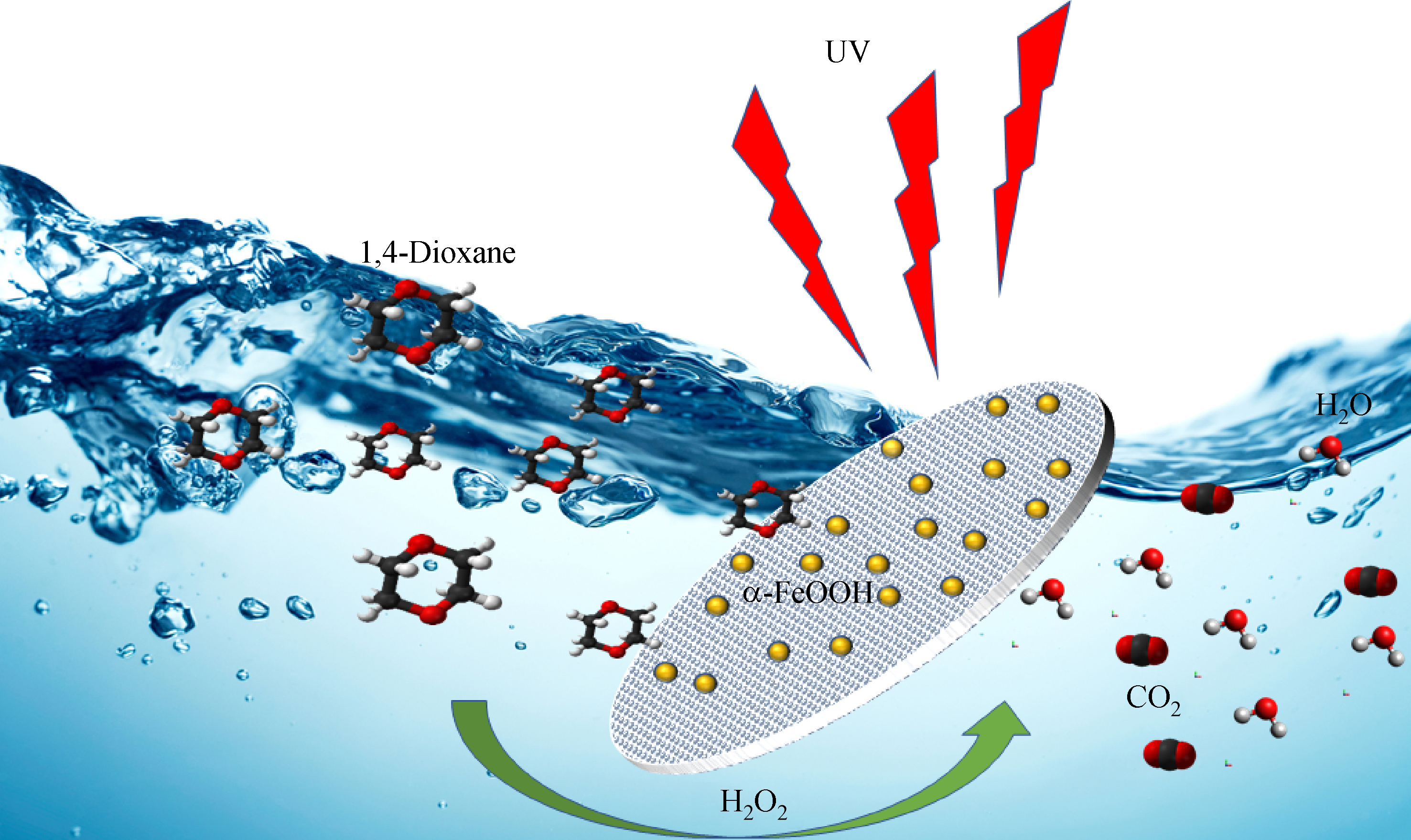 The present study evaluated a photo-Fenton reactive membrane that achieved enhanced 1,4-Dioxane removal performance. As a common organic solvent and stabilizer, 1,4-Dioxane is widely used in a variety of industrial products and poses negative environmental and health impacts. The membrane was prepared by covalently coating photocatalyst of goethite (α-FeOOH) on a ceramic porous membrane as we reported previously. The effects of UV irradiation, H2O2 and catalyst on the removal efficiency of 1,4-Dioxane in batch reactors were first evaluated for optimized reaction conditions, followed by a systematical investigation of 1,4-Dioxane removal in the photo-Fenton membrane filtration mode. Under optimized conditions, the 1,4-Dioxane removal rate reached up to 16% with combination of 2 mmol/L H2O2 and UV365 irradiation (2000 µW/cm2) when the feed water was filtered by the photo-Fenton reactive membrane at a hydraulic retention time of 6 min. The removal efficiency and apparent quantum yield (AQY) were both enhanced in the filtration compared to the batch mode of the same photo-Fenton reaction. Moreover, the proposed degradation pathways were analyzed by density functional theory (DFT) calculations, which provided a new insight into the degradation mechanisms of 1,4-Dioxane in photo-Fenton reactions on the functionalized ceramic membrane.