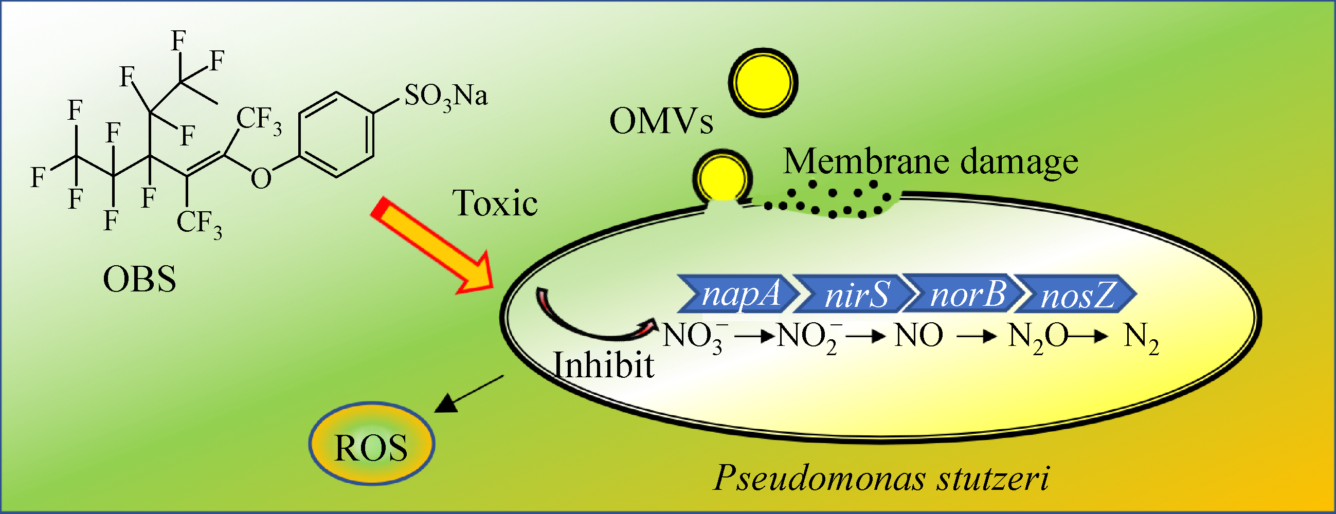 The toxicities of sodium perfluorononyloxy-benzenesulfonate (OBS) to animals and plants are similar to those of perfluorooctane sulfonate. However, the mechanism of its toxicity to aerobic denitrifying bacteria is still unclear. In the present study, the ecotoxicity of OBS on an aerobic denitrifying strain, Pseudomonas stutzeri, was evaluated. The results showed that a dosage of OBS clearly affected the growth and aerobic denitrification of P. stutzeri. When compared with an unamended control, the degradation efficiency of the total nitrogen decreased by 30.13% during exposure to 200 mg/L of OBS, and the complete degradation time of nitrate-nitrogen was delayed by 4 h. The lactate dehydrogenase and superoxide dismutase produced by the bacteria increased with the concentration of OBS, and reactive oxygen species were also detected by confocal laser scanning microscope imaging. Transmission electron microscope imaging revealed chromosome deformation of the cells and damage to cell content; moreover, outer membrane vesicles were secreted from the bacteria, which was the important detoxification mechanism of P. stutzeri to OBS. Expression of the genes involved in aerobic nitrification and oxidative stress were also changed under OBS stress, which further confirmed the toxicity of OBS to P. stutzeri. This study reveals the environmental exposure risk of OBS from the perspective of microorganisms.