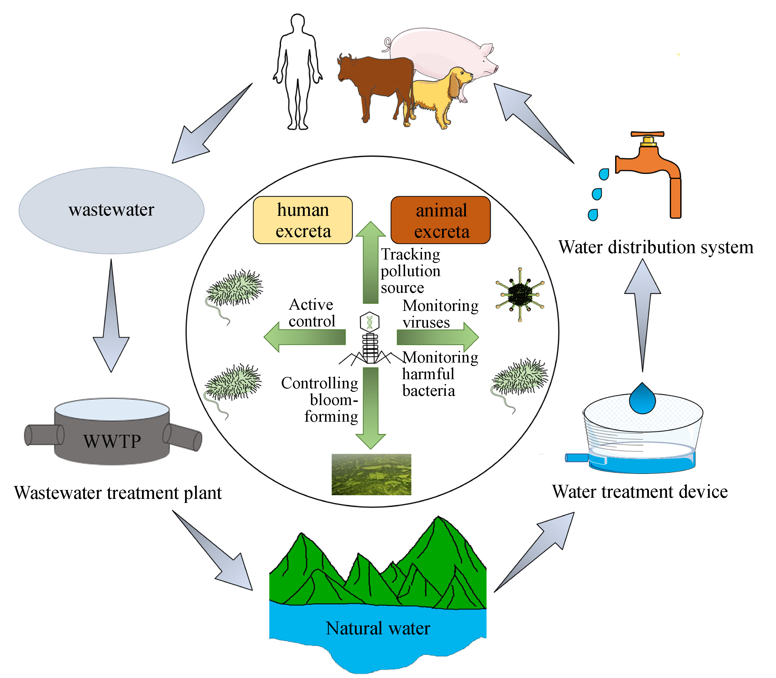 •Phages can be better indicators of enteric viruses than fecal indicator bacteria. •Multiple phages should be added to the microbial source tracking toolbox. •Engineered phage or phage cocktail can effectively target resistant bacteria. •In phage use, phage-mediated horizontal gene transfer cannot be ignored. •More schemes are needed to prevent phage concentration from decreasing.