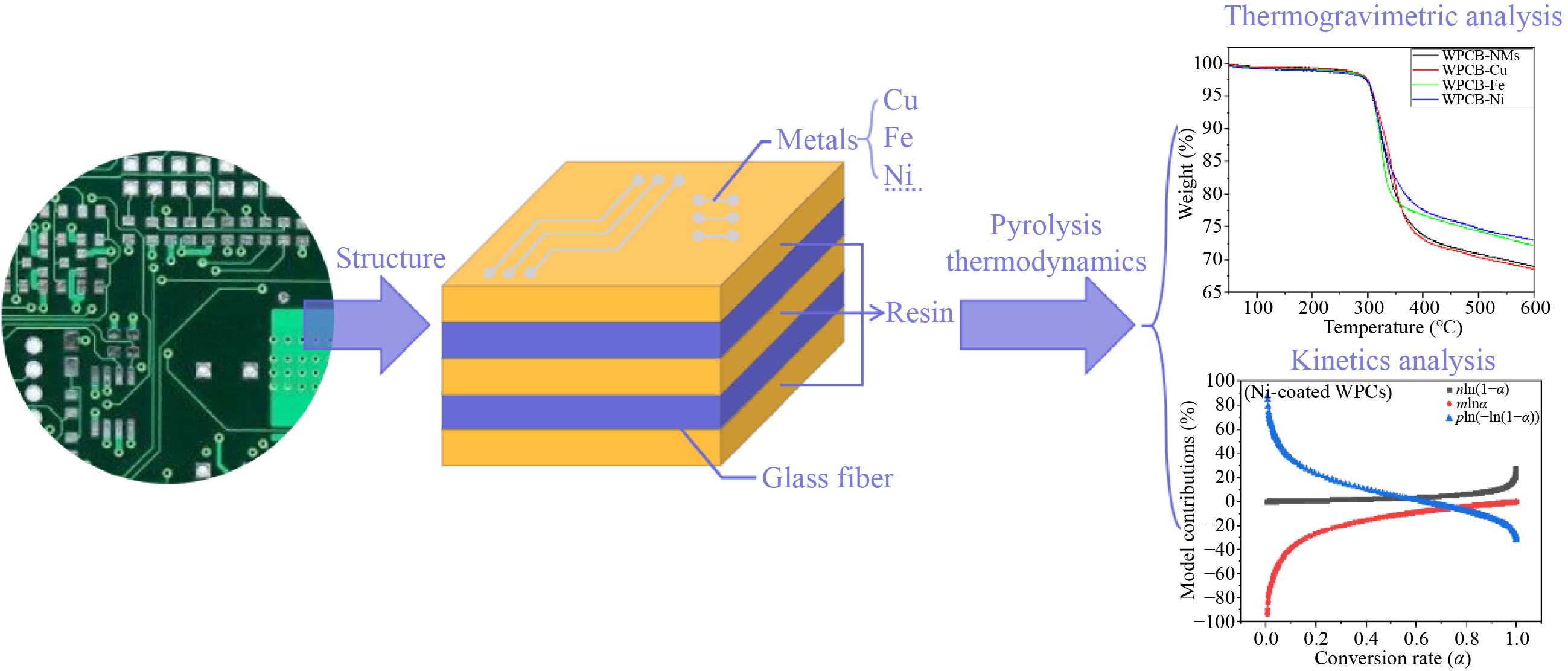 Waste printed circuit boards (WPCBs) are generated increasingly recent years with the rapid replacement of electric and electronic products. Pyrolysis is considered to be a potential environmentally-friendly technology for recovering organic and metal resources from WPCBs. Thermogravimetric analysis and kinetic analysis of WPCBs were carried out in this study. It showed that the co-existing metals (Cu, Fe, Ni) in WPCBs have positive self-catalytic influence during the pyrolysis process. To illustrate their catalytic effects, the apparent activation energy was calculated by differential model. Contributions of different reactions during catalytic pyrolysis process was studied and the mechanism function was obtained by Šesták-Berggren model. The results showed that Cu, Fe, Ni can promote the reaction progress and reduce the apparent activation energy. Among the three metals, Ni plays better catalytic role than Cu, then Fe. This work provides theoretical base for understanding the three metals’ catalytic influence during the pyrolysis of non-metal powders in WPCBs.