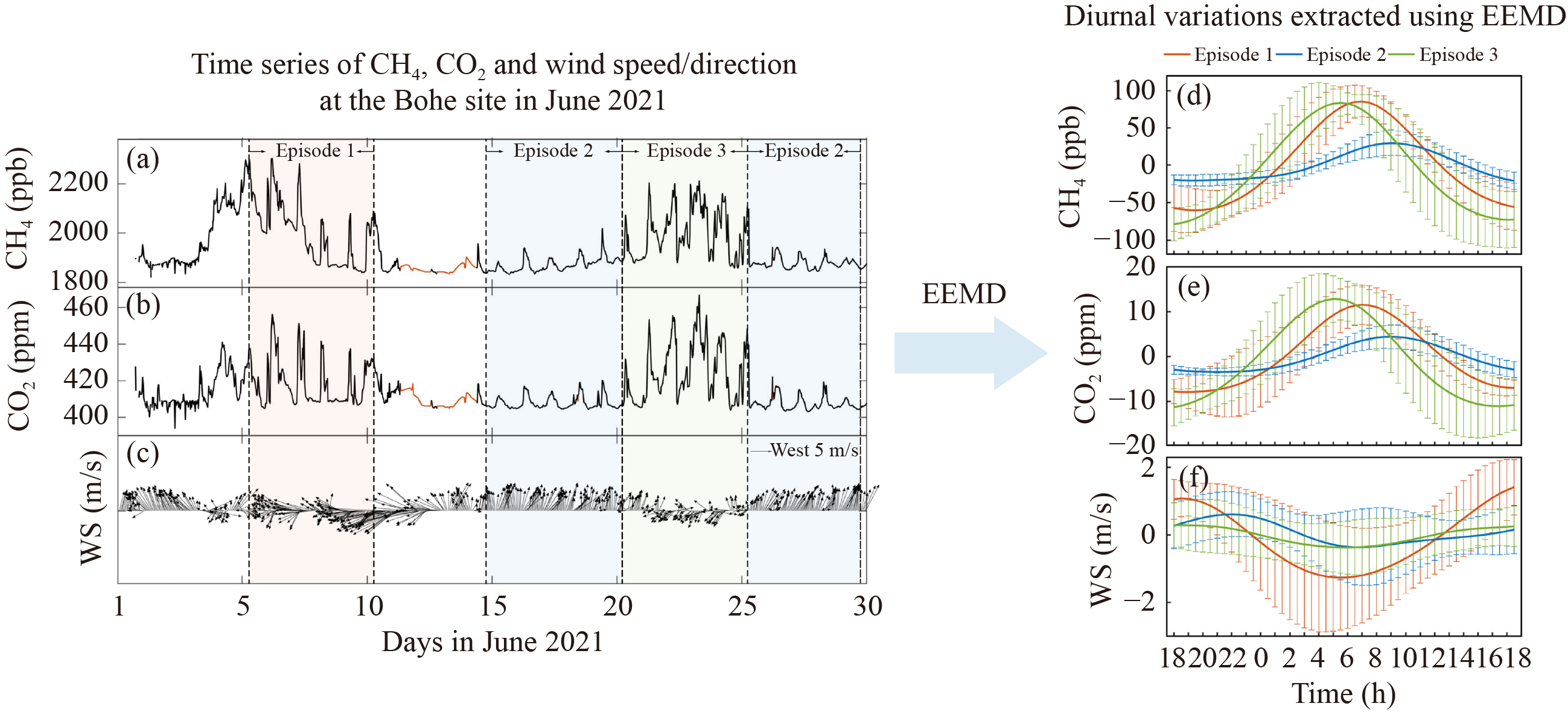 ● Diurnal patterns of CH4 and CO2 are clearly extracted using EEMD. ● CH4 and CO2 show mid-morning high and evening low patterns during sea breezes. ● Wind direction significantly modulates the diurnal variations in CH4 and CO2.