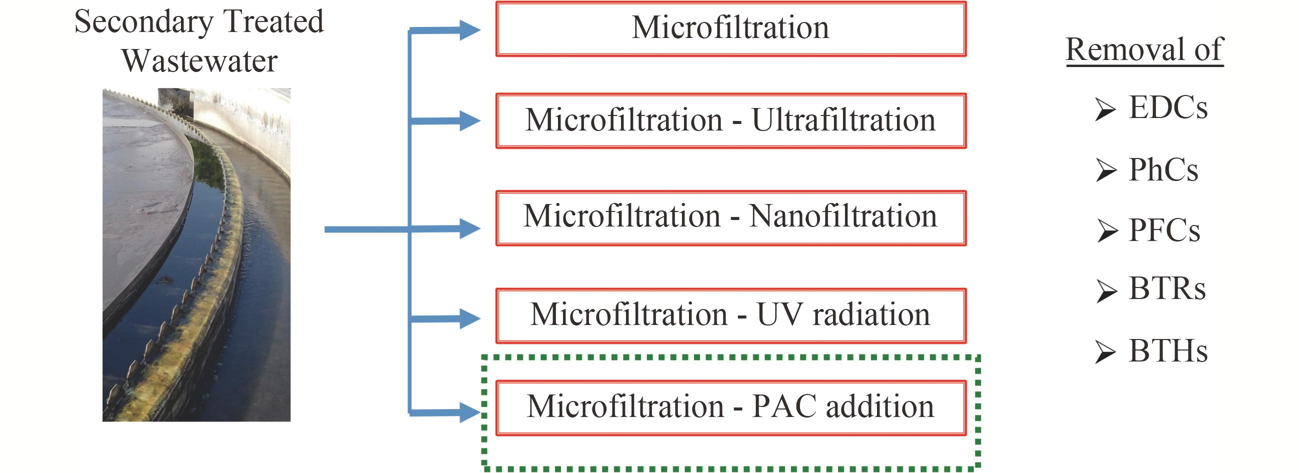 In this work, 38 different organic emerging contaminants (ECs), belonging to various chemical classes such as pharmaceuticals (PhCs), endocrine-disrupting chemicals (EDCs), benzotriazoles (BTRs), benzothiazoles (BTHs), and perfluorinated compounds (PFCs), were initially identified and quantified in the biologically treated wastewater collected from Athens’ (Greece) Sewage Treatment Plant (STP). Processes already used in existing STPs such as microfiltration (MF), nanofiltration (NF), ultrafiltration (UF), UV radiation, and powdered activated carbon (PAC) were assessed for ECs’ removal, under the conditions that represent their actual application for disinfection or advanced wastewater treatment. The results indicated that MF removed only one out of the 38 ECs and hence it was selected as pretreatment step for the other processes. UV radiation in the studied conditions showed low to moderate removal for 5 out of the 38 ECs. NF showed better results than UF due to the smaller pore sizes of the filtration system. However, this enhancement was observed mainly for 8 compounds originating from the classes of PhCs and PFCs, while the removal of EDCs was not statistically significant. Among the various studied technologies, PAC stands out due to its capability to sufficiently remove most ECs. In particular, removal rates higher than 70% were observed for 9 compounds, 22 were partially removed, while 7 demonstrated low removal rates. Based on our screening experiments, future research should focus on scaling-up PAC in actual conditions, combining PAC with other processes, and conduct a complete economic and environmental assessment of the treatment.