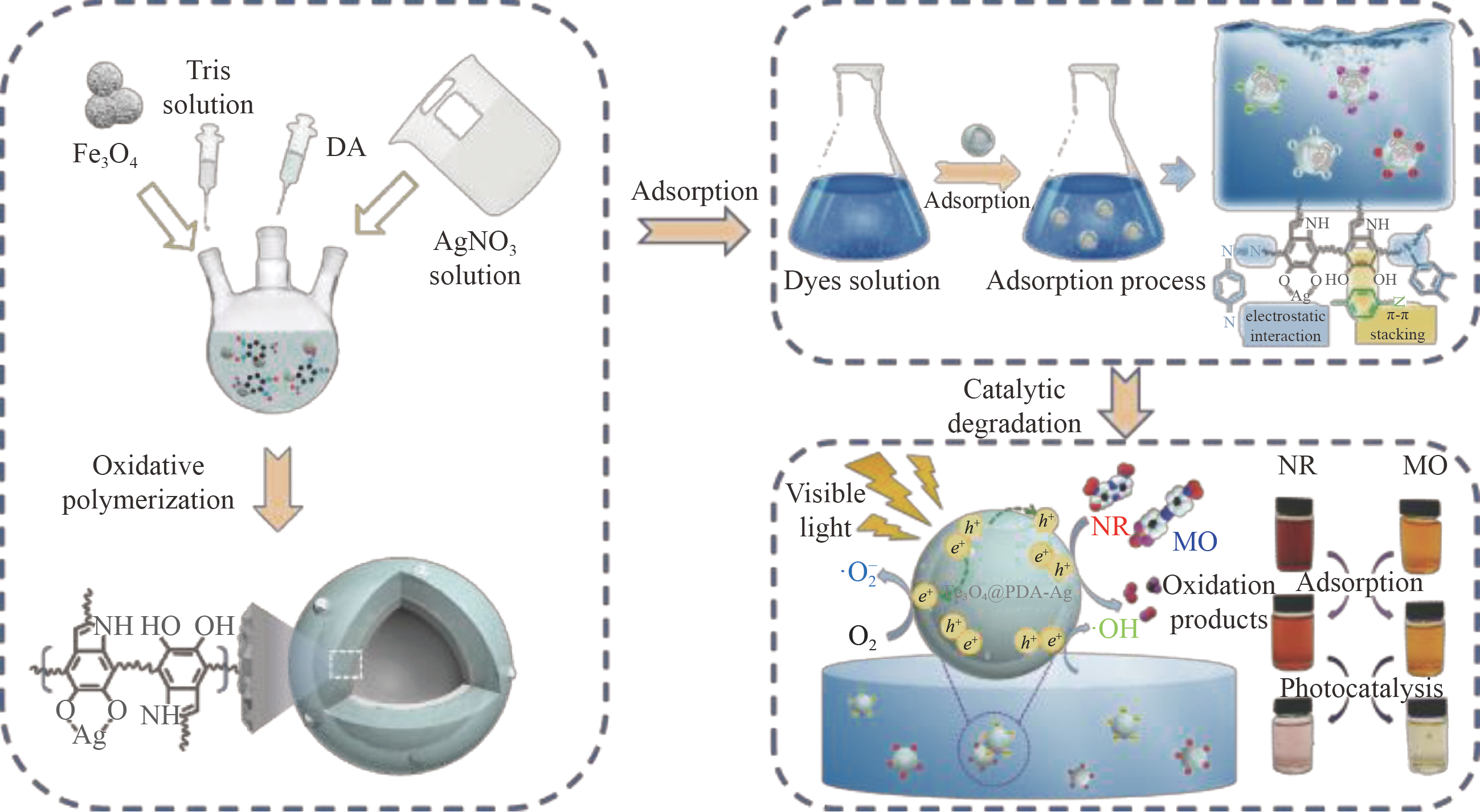 ● PDA-Fe3O4-Ag was made by hydrothermal and oxidation self-polymerization method. ● PDA-Fe3O4-Ag had great magnetic separation performance. ● PDA-Fe3O4-Ag had good adsorption and degradation performance for ionic dyes. ● PDA-Fe3O4-Ag showed NR and MO degradation potential of 91.2% and 87.5%, respectively.