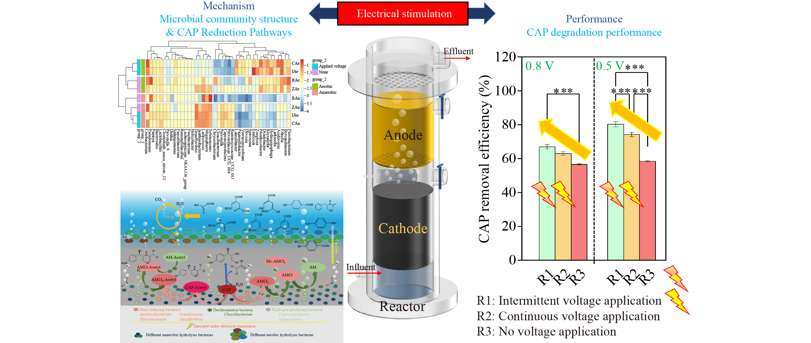 Exoelectrogenic biofilms have received considerable attention for their ability to enhance electron transfer between contaminants and electrodes in bioelectrochemical systems. In this study, we constructed anaerobic-aerobic-coupled upflow bioelectrochemical reactors (AO-UBERs) with different voltage application modes, voltages and hydraulic retention times (HRTs). In addition, we evaluated their capacity to remove chloramphenicol (CAP). AO-UBER can effectively mineralize CAP and its metabolites through electrical stimulation when an appropriate voltage is applied. The CAP removal efficiencies were ~81.1%±6.1% (intermittent voltage application mode) and 75.2%±4.6% (continuous voltage application mode) under 0.5 V supply voltage, which were ~21.5% and 15.6% greater than those in the control system without voltage applied, respectively. The removal efficiency is mainly attributed to the anaerobic chamber. High-throughput sequencing combined with catabolic pathway analysis indicated that electrical stimulation selectively enriched Megasphaera, Janthinobacterium, Pseudomonas, Emticicia, Zoogloea, Cloacibacterium and Cetobacterium, which are capable of denitrification, dechlorination and benzene ring cleavage, respectively. This study shows that under the intermittent voltage application mode, AO-UBERs are highly promising for treating antibiotic-contaminated wastewater.