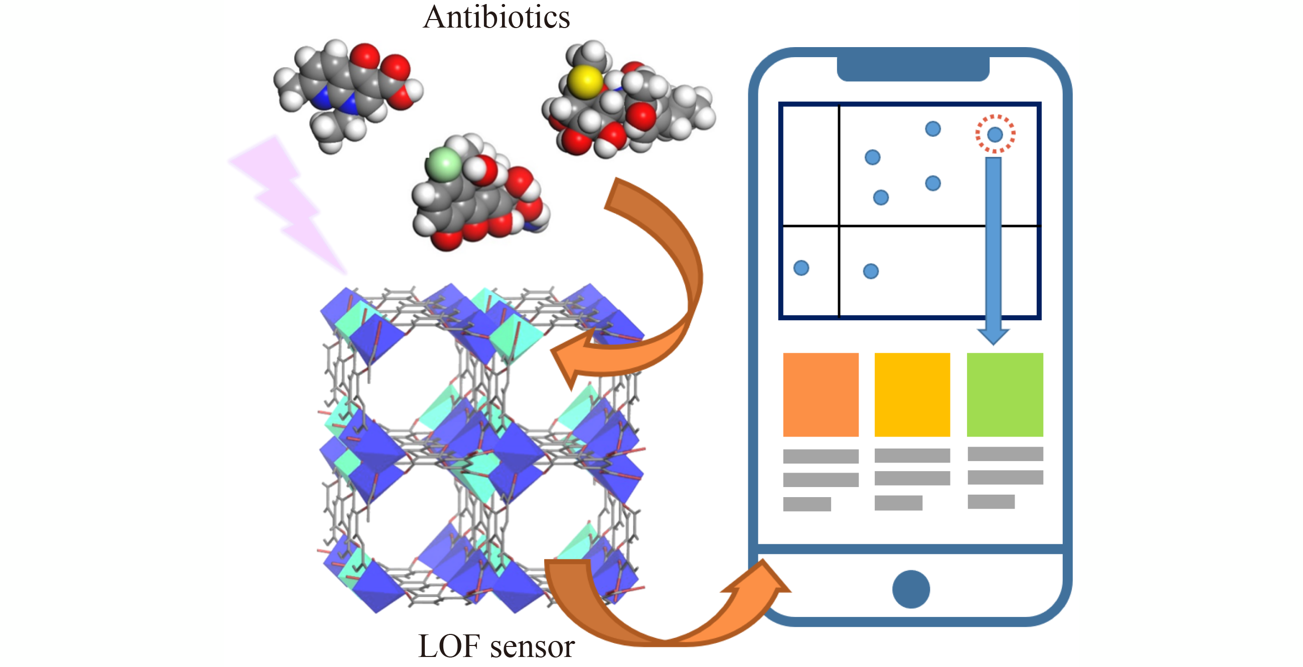 ● A series of mixed-LOFs and portable LOF-fibers were synthesized. ● LOF-S3 was selected as a luminescent sensor for antibiotics. ● Mixed-LOF was capable of decoding antibiotics by emission intensity ratios. ● Linear relationship between antibiotic concentration and I545nm/I618nm was observed.
