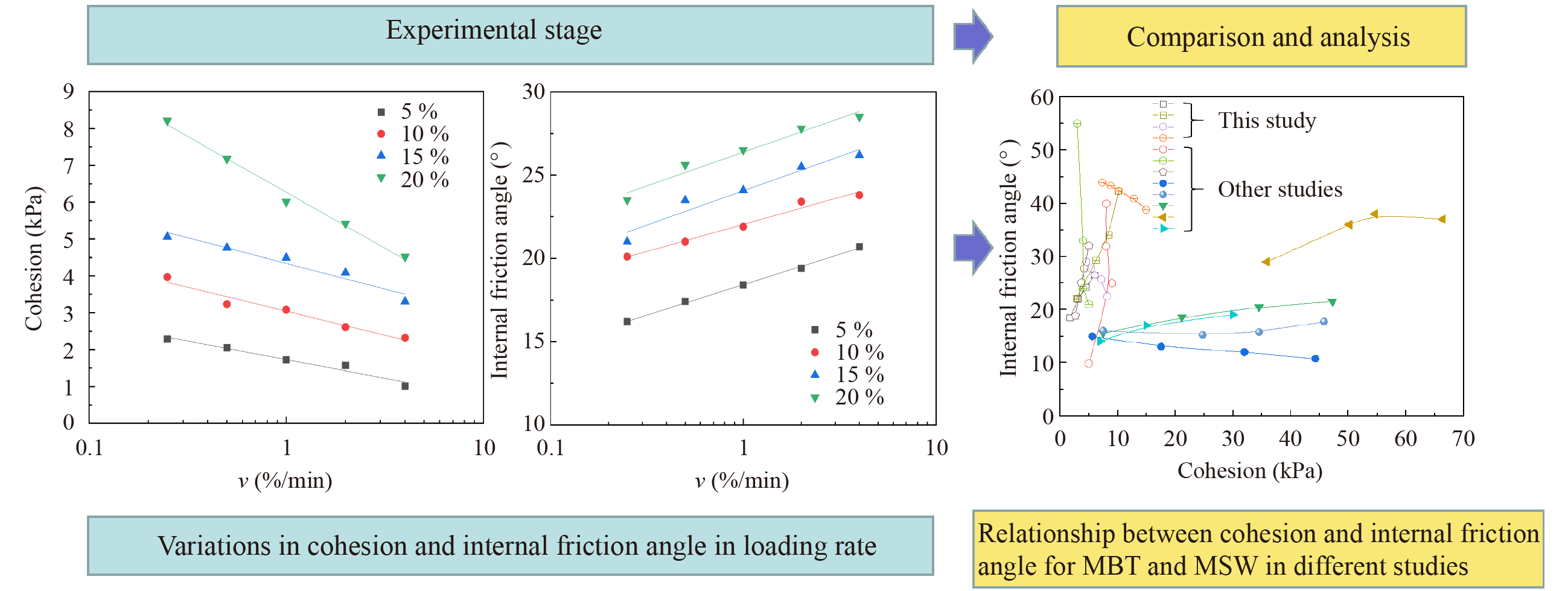 Mechanical biological treatment (MBT) technology has attracted increasing attention because it can reduce the volume of waste produced. To deal with the current trend of increasing waste, MBT practices are being adopted to address waste generated in developing urban societies. In this study, a total of 20 specimens of consolidated undrained triaxial tests were conducted on waste obtained from the Hangzhou Tianziling landfill, China, to evaluate the effect of loading rate on the shear strength parameters of MBT waste. The MBT waste samples exhibited an evident strain-hardening behavior, and no peak was observed even when the axial strain exceeded 25%. Further, the shear strength increased with an increase in the loading rate; the effect of loading rate on shear strength under a low confining pressure was greater than that under a high confining pressure. Furthermore, the shear strength parameters of MBT waste were related to the loading rate. The relationship between the cohesion, internal friction angle, and logarithm of the loading rate could be fitted to a linear relationship, which was established in this study. Finally, the ranges of shear strength parameters cohesion c and effective cohesion c ´ were determined as 1.0–8.2 kPa and 2.1–14.9 kPa, respectively; the ranges of the internal friction angle φ and effective internal friction angle φ ´ were determined as 16.2°–29° and 19.8°–43.9°, respectively. These results could be used as a valuable reference for conducting stability analyses of MBT landfills.