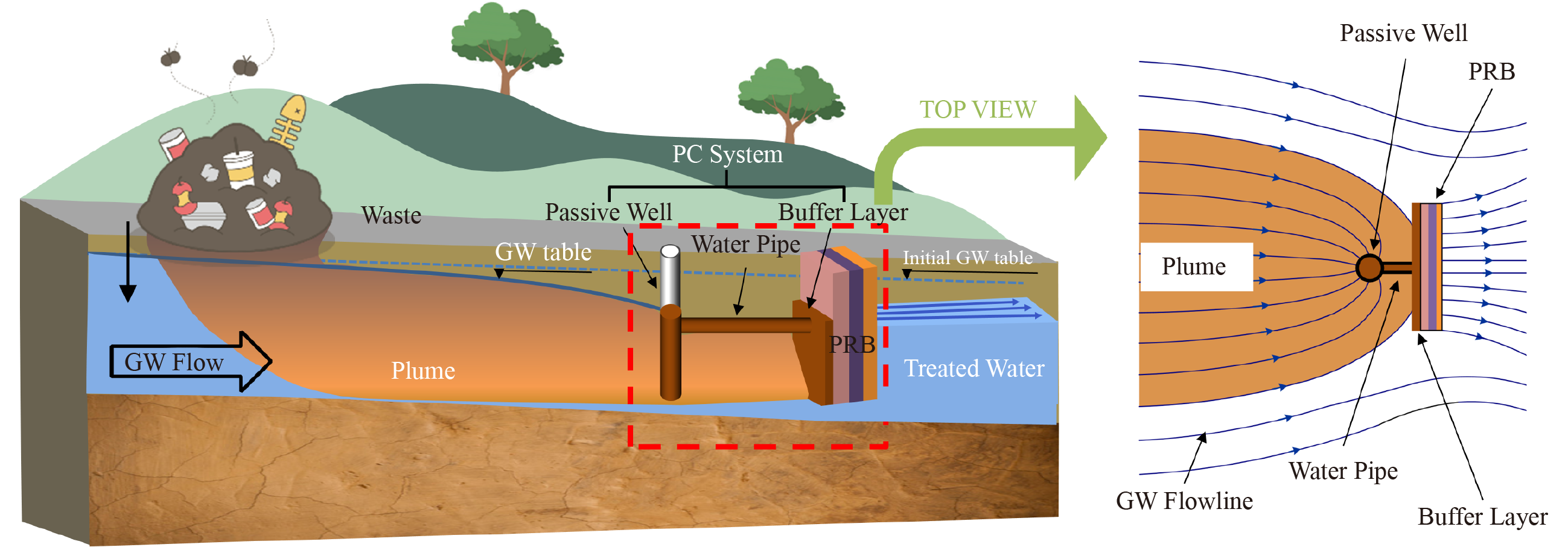 A novel permeable reactive barrier (PRB) configuration, the so-called passive convergence-permeable reactive barrier (PC-PRB), is proposed to overcome several shortcomings of traditional PRB configurations, such as high dependency to site hydrogeological characteristics and plume size. The PC-PRB is designed to make the plume converge towards the PRB due to the passive hydraulic decompression-convergent flow effect. The corresponding passive groundwater convergence (PC) system is deployed upstream of the PRB system, which consists of passive wells, water pipes, and a buffer layer. A two-dimensional (2D) finite-difference hydrodynamic code, entitled PRB-Flow, is developed to examine the hydraulic performance parameters (i.e., capture width (W) and residence time (t)) of PC-PRB. It is proved that the horizontal 2D capture width (Wh) and vertical 2D capture depth (Wv) of the PC-PRB remarkably increase compared to that of the continuous reactive barrier (C-PRB). The aforementioned relative growth values in order are greater than 50% and 25% in this case study. Therefore, the PRB geometric dimensions as well as the materials cost required for the same plume treatment lessens. The sensitivity analysis reveals that the dominant factors influencing the hydraulic performance of the PC-PRB are the water pipe length (Lp), PRB length (LPRB), passive well height (Hw), and PRB height (HPRB). The discrepancy between the Wh of PC-PRB and that of the C-PRB (i.e., ΔWh) has a low correlation with PRB parameters and mainly depends on Lp, which could dramatically simplify the PC-PRB design procedure. Generally, the proposed PC-PRB exhibits an effective PRB configuration to enhance hydraulic performance.