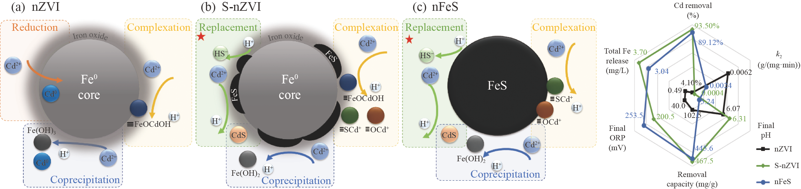 ● nZVI, S-nZVI, and nFeS were systematically compared for Cd(II) removal. ● Cd(II) removal by nZVI involved coprecipitation, complexation, and reduction. ● The predominant reaction for Cd(II) removal by S-nZVI and nFeS was replacement. ● A simple pseudo-second-order kinetic can adequately fit Fe(II) dissolution.