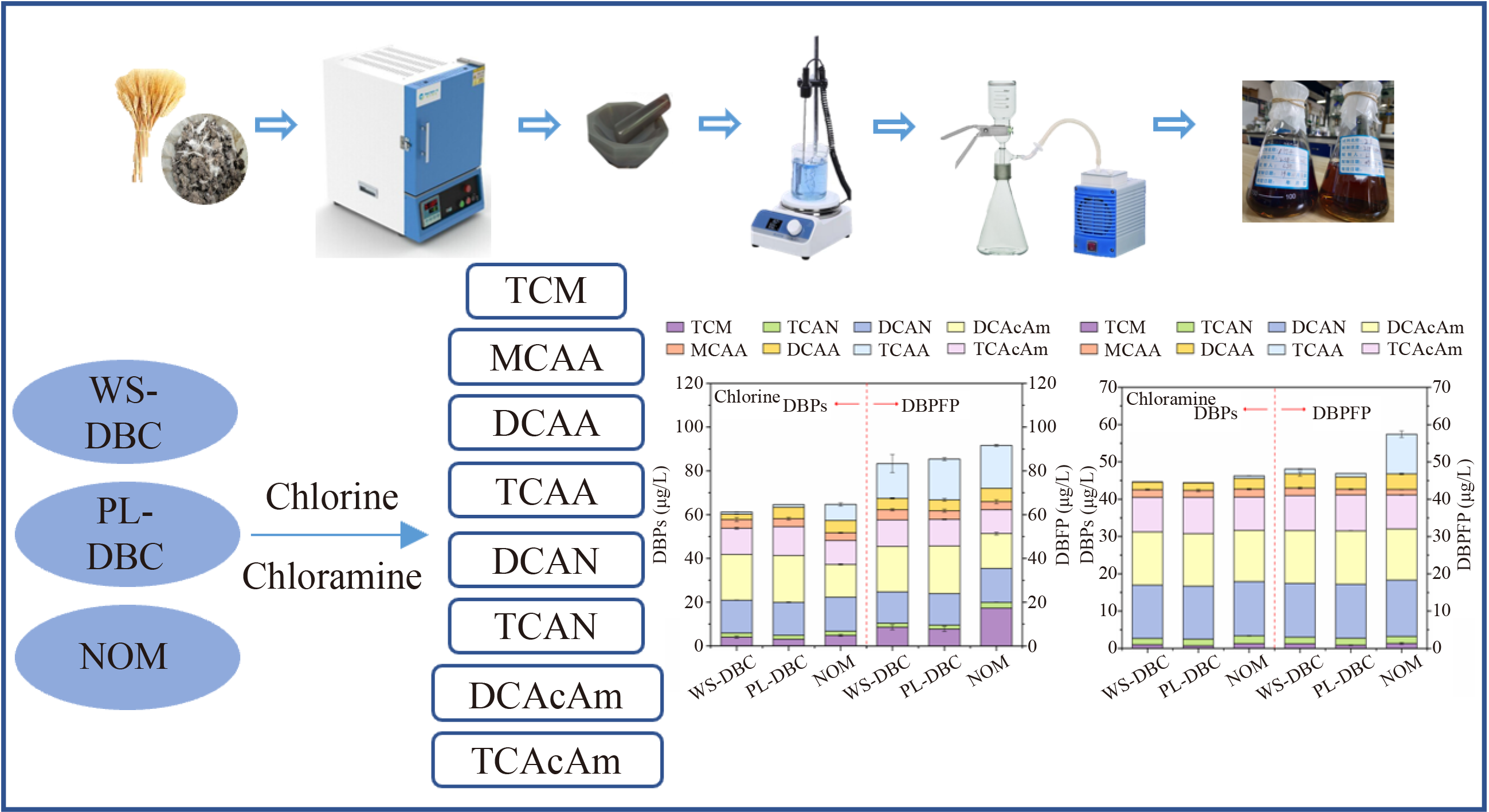 Dissolved black carbon (DBC) released from biochar can be one of the potential disinfection by-products (DBPs) precursors in the dissolved organic matter pool. However, the physiochemical and structural properties of DBC and the effects on the development of DBPs and DBP formation potential (DBPFP) during the disinfection process remain unclear. In this study, the characteristics of two kinds of DBC, namely, animal-derived DBC (poultry litter DBC, PL-DBC) and plant-derived DBC (wheat straw DBC, WS-DBC), were investigated. The effects of different kinds of DBC on the evolution of DBPs and DBPFP in chlorine and chloramine disinfection processes were compared with natural organic matter (NOM). The results showed that the total DBPs concentrations derived from PL-DBC, WS-DBC and NOM were similar during chlorination (i.e., 61.23 μg/L, 64.59 μg/L and 64.66 μg/L, respectively) and chloramination (i.e., 44.63 μg/L, 44.42 μg/L and 45.58 μg/L, respectively). The lower total DBPs and DBPFP concentrations in chloramination could be attributed to the fact that the introduction of ammonia in chloramine inhibited the breaking of the bond between the disinfectant and the active group of the precursor. Additionally, DBC presented much lower total DBPFP concentrations than NOM in both chlorination and chloramination. However, both kinds of DBC tended to form more monochloroacetic acids and haloacetamides than NOM, which could result from the higher organic strength, higher protein matter, and nitrogen-rich soluble microbial products of DBC.