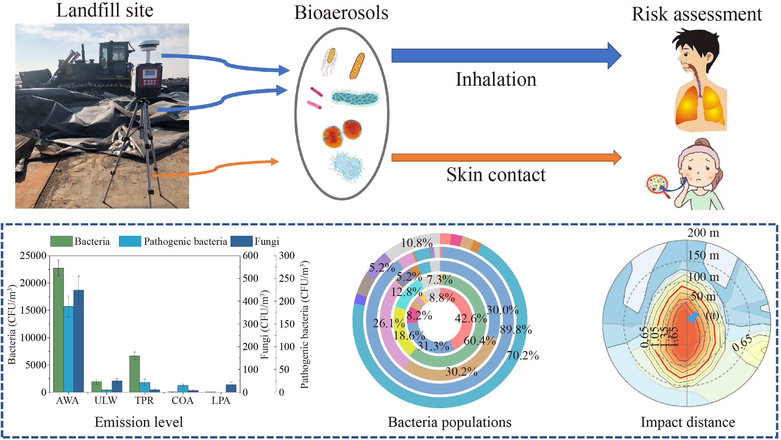 ● The airborne bacteria in landfills were 4–50 times higher than fungi. ● Bioaerosols released from the working area would pose risk to on-site workers. ● The safe distance for the working area should be set as 80 m.