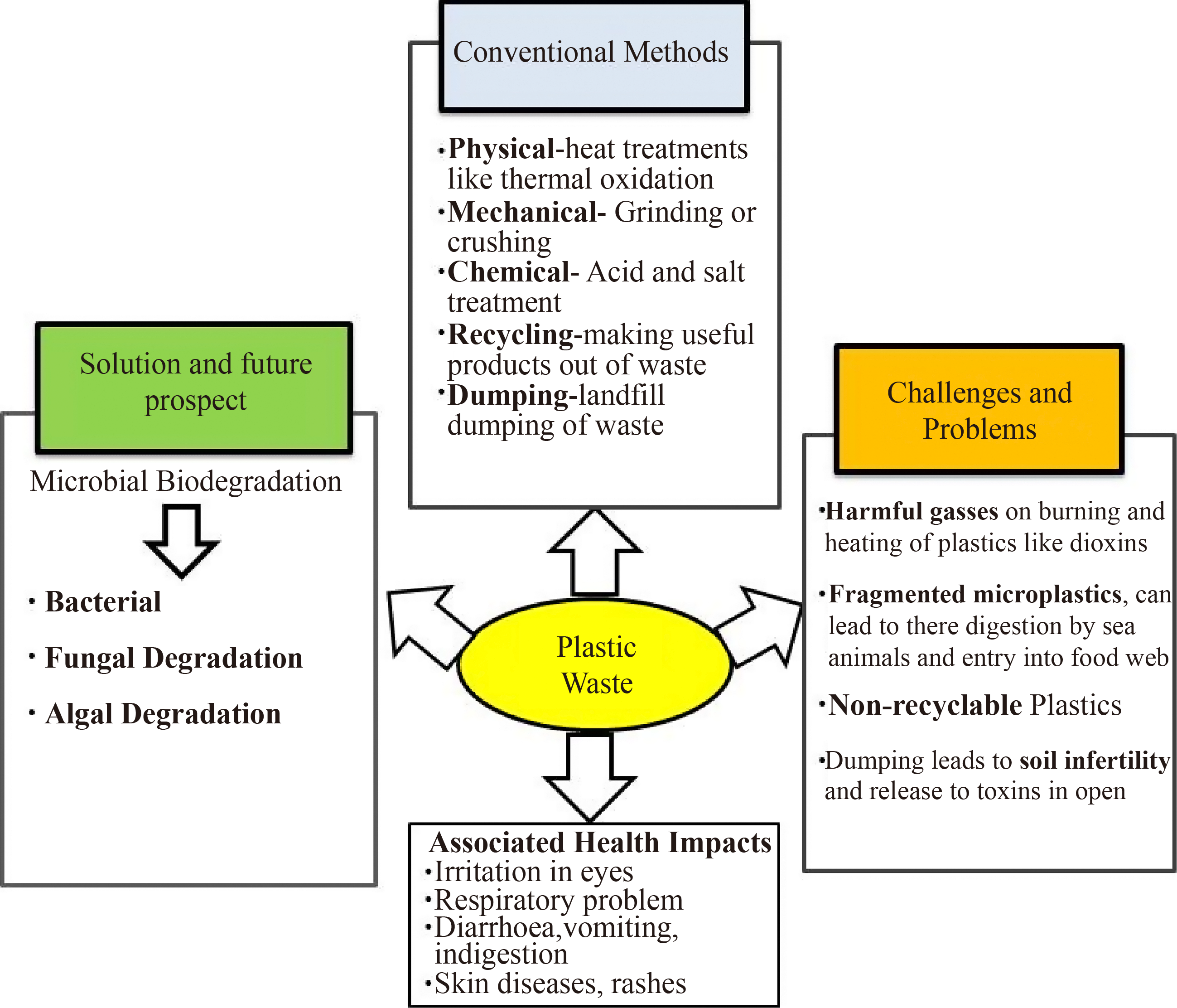 The abundance of synthetic polymers has increased due to their uncontrolled utilization and disposal in the environment. The recalcitrant nature of plastics leads to accumulation and saturation in the environment, which is a matter of great concern. An exponential rise has been reported in plastic pollution during the corona pandemic because of PPE kits, gloves, and face masks made up of single-use plastics. The physicochemical methods have been employed to degrade synthetic polymers, but these methods have limited efficiency and cause the release of hazardous metabolites or by-products in the environment. Microbial species, isolated from landfills and dumpsites, have utilized plastics as the sole source of carbon, energy, and biomass production. The involvement of microbial strains in plastic degradation is evident as a substantial amount of mineralization has been observed. However, the complete removal of plastic could not be achieved, but it is still effective compared to the pre-existing traditional methods. Therefore, microbial species and the enzymes involved in plastic waste degradation could be utilized as eco-friendly alternatives. Thus, microbial biodegradation approaches have a profound scope to cope with the plastic waste problem in a cost-effective and environmental-friendly manner. Further, microbial degradation can be optimized and combined with physicochemical methods to achieve substantial results. This review summarizes the different microbial species, their genes, biochemical pathways, and enzymes involved in plastic biodegradation.