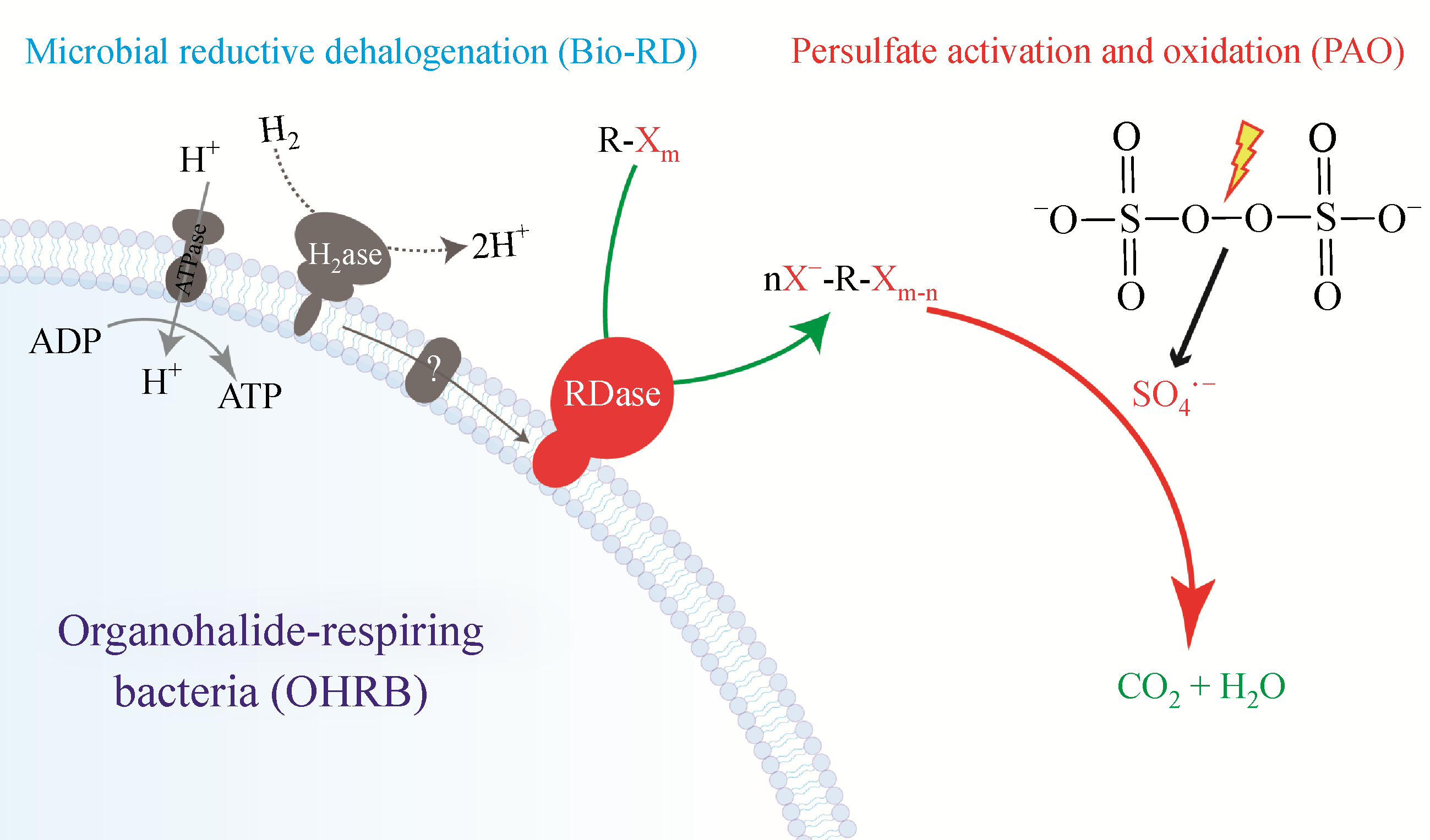 Due to the toxicity of bioaccumulative organohalides to human beings and ecosystems, a variety of biotic and abiotic remediation methods have been developed to remove organohalides from contaminated environments. Bioremediation employing organohalide-respiring bacteria (OHRB)-mediated microbial reductive dehalogenation (Bio-RD) represents a cost-effective and environmentally friendly approach to attenuate highly-halogenated organohalides, specifically organohalides in soil, sediment and other anoxic environments. Nonetheless, many factors severely restrict the implications of OHRB-based bioremediation, including incomplete dehalogenation, low abundance of OHRB and consequent low dechlorination activity. Recently, the development of in situ chemical oxidation (ISCO) based on sulfate radicals (SO4·−) via the persulfate activation and oxidation (PAO) process has attracted tremendous research interest for the remediation of lowly-halogenated organohalides due to its following advantages, e.g., complete attenuation, high reactivity and no selectivity to organohalides. Therefore, integration of OHRB-mediated Bio-RD and subsequent PAO (Bio-RD-PAO) may provide a promising solution to the remediation of organohalides. In this review, we first provide an overview of current progress in Bio-RD and PAO and compare their limitations and advantages. We then critically discuss the integration of Bio-RD and PAO (Bio-RD-PAO) for complete attenuation of organohalides and its prospects for future remediation applications. Overall, Bio-RD-PAO opens up opportunities for complete attenuation and consequent effective in situ remediation of persistent organohalide pollution.