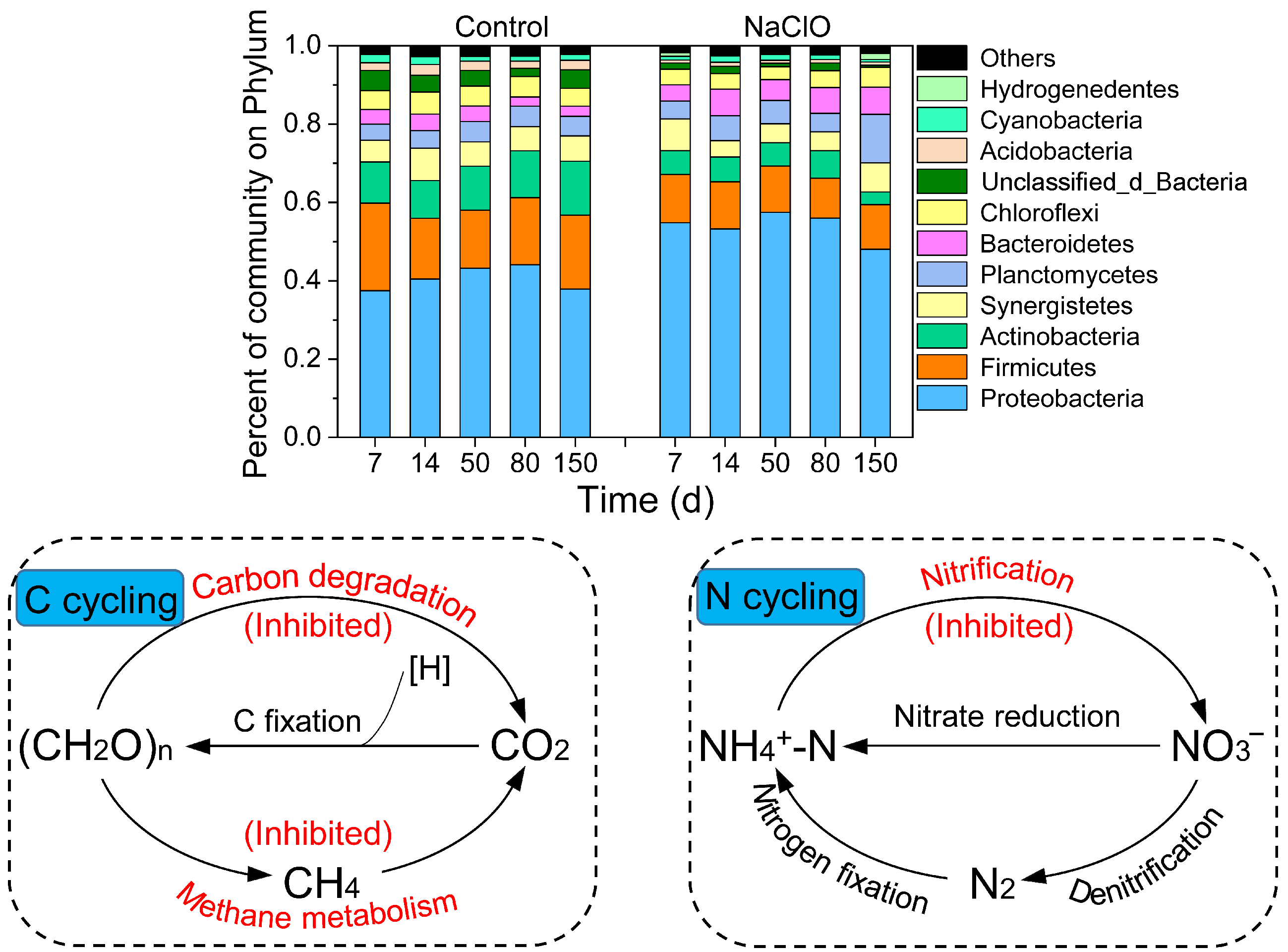 Chlorine is often used in algal removal and deodorization of landscape waters, and occasionally used as an emergency treatment of heavily polluted sediments. However, the ecological impact of this practice has not been fully studied and recognized. In this study, NaClO at 0.1 mmol/g based on dry weight sediment was evenly mixed into the polluted sediment, and then the sediment was incubated for 150 days to evaluate its microbial effect. Results showed that NaClO addition enhanced the release of TOC, TN, Cr and Cu from the sediment. The microbial richness in the examined sediment decreased continuously, and the Chao1 index declined from 4241 to 2731, in 150 days. The microbial community composition was also changed. The abundance of Proteobacteria and Bacteroidetes increased to 54.8% and 4.2% within 7 days compared to the control, and linear discriminant analysis (LDA) showed gram-negative bacteria and aerobic bacteria enriched after chlorination. The functional prediction with PICRUSt2 showed the functions of the microbial community underwent major adjustments, and the metabolic-related functions such as carbon metabolism, including pyruvate and methane metabolisms were significantly inhibited; besides, 15 out of 22 analyzed key enzymes involved in C cycling and 6 out of 12 key enzymes or genes involved in N cycling were strongly impacted, and the enzymes and genes involved in carbon degradation and denitrification showed remarkable downregulation. It can be concluded that chlorination posed a seriously adverse effect on microbial community structure and function. This study deepens the understanding of the ecological effects of applying chlorine for environmental remediation.