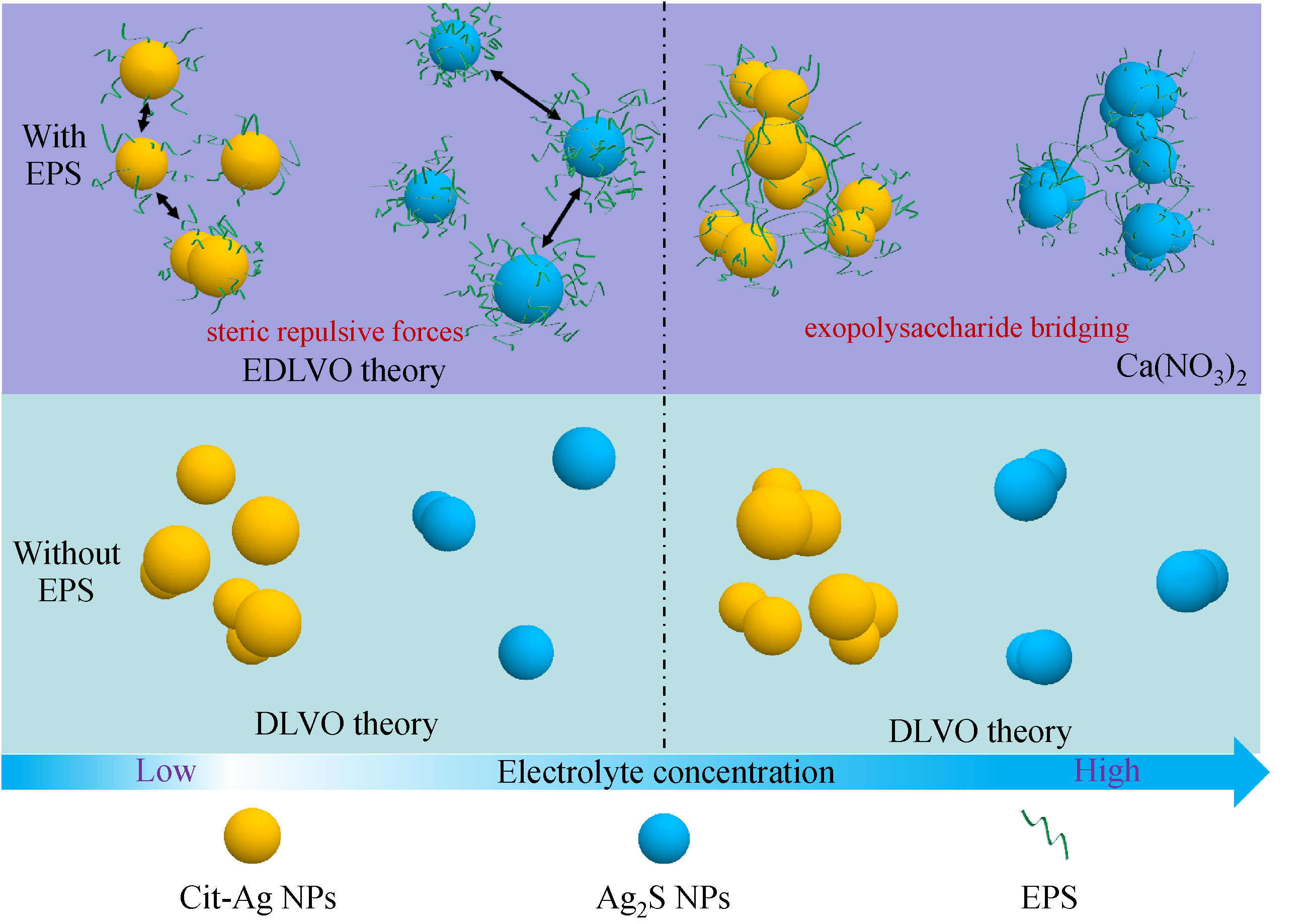 • The NPs aggregation in the electrolyte solution is consistent with the DLVO theory. • In NaNO3 and low Ca(NO3)2, EPS alleviates the NPs aggregation by steric repulsion. • In high Ca(NO3)2, EPS accelerates the NPs aggregation by exopolysaccharide bridging. • Ag2S NPs have stronger stability compared with Cit-Ag NPs in aqueous systems.