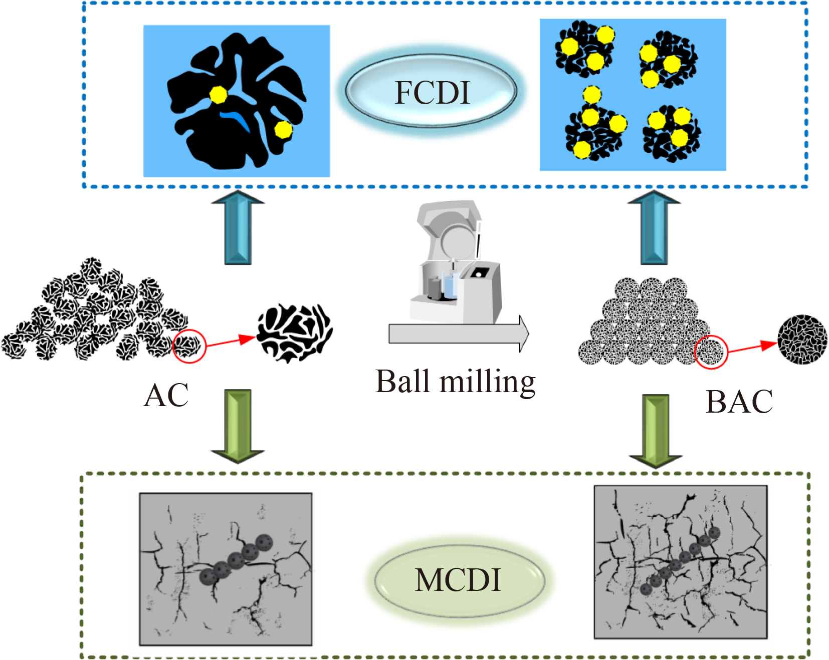 Capacitive deionization (CDI) is a novel electrochemical water-treatment technology. The electrode material is an important factor in determining the ion separation efficiency. Activated carbon (AC) is extensively used as an electrode material; however, there are still many deficiencies in commercial AC. We adopted a simple processing method, ball milling, to produce ball milled AC (BAC) to improve the physical and electrochemical properties of the original AC and desalination efficiency. The BAC was characterized in detail and used for membrane capacitive deionization (MCDI) and flow-electrode capacitive deionization (FCDI) electrode materials. After ball milling, the BAC obtained excellent pore structures and favorable surfaces for ion adsorption, which reduced electron transfer resistance and ion migration resistance in the electrodes. The optimal ball-milling time was 10 h. However, the improved effects of BAC as fixed electrodes and flow electrodes are different and the related mechanisms are discussed in detail. The average salt adsorption rates (ASAR) of FCDI and MCDI were improved by 134% and 17%, respectively, and the energy-normalized removal salt (ENRS) were enhanced by 21% and 53%, respectively. We believe that simple, low-cost, and environmentally friendly BAC has great potential for practical engineering applications of FCDI and MCDI.