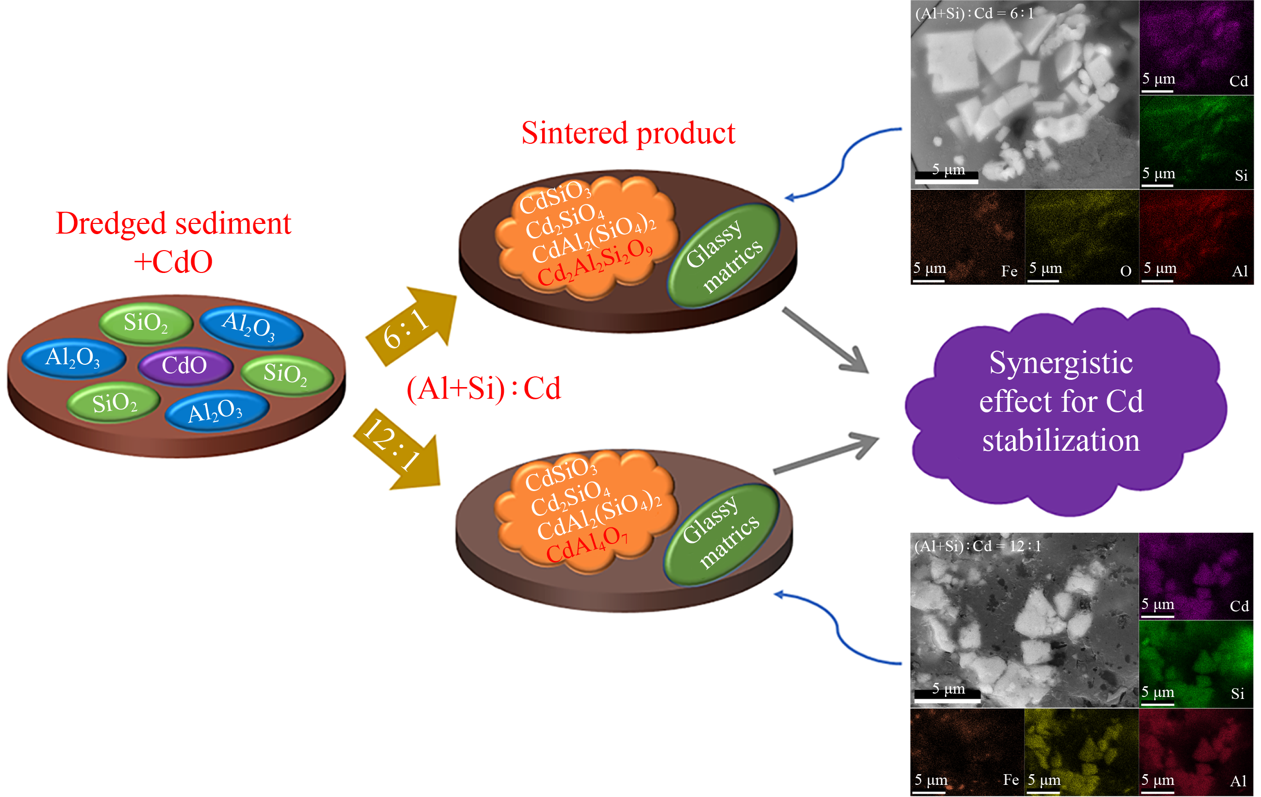 Cd-bearing solid wastes are considered to be a serious threat to the environment, and effective strategies for their treatment are urgently needed. Ceramic sintering has been considered as a promising method for efficiently incorporating heavy metal-containing solid wastes into various ceramic products. Mineral-rich dredged river sediment, especially Al and Si-containing oxides, can be treated as alternative ceramic precursors rather than being disposed of as solid wastes. To examine the feasibility of using waste sediment for Cd stabilization and the phase transition mechanisms, this study conducted a sintering scheme for the mixtures of CdO and dredged river sediment with different (Al+Si):Cd mole ratios. Detailed investigations have been performed on phases transformation, Cd incorporation mechanisms, elemental distribution, and leaching behaviors of the sintered products. Results showed that Cd incorporation and transformation in the sintered products were influenced by the mole ratio of (Al+Si):Cd. Among the high-Cd series ((Al+Si):Cd = 6:1), CdSiO3, Cd2SiO4, CdAl2(SiO4)2 and Cd2Al2Si2O9 were predominant Cd-containing product phases, while Cd2Al2Si2O9 was replaced by CdAl4O7 when the mole ratio of (Al+Si):Cd was 12:1 (low-Cd series). Cd was efficiently stabilized in both reaction series after being sintered at ≥ 900 °C, with < 5% leached ratio even after a prolonged leaching time, indicating excellent long-term Cd stabilization. This study demonstrated that both Cd-containing phases and the amorphous Al-/Si-containing matrices all played critical roles in Cd stabilization. A promising strategy can be proposed to simultaneously reuse the solid waste as ceramic precursors and stabilize heavy metals in the ceramic products.
