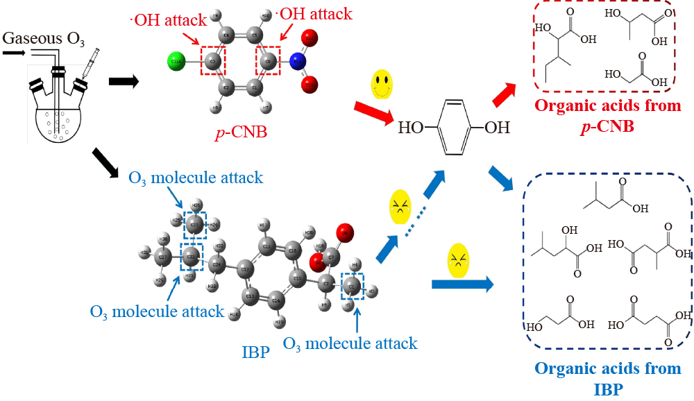 For aromatic monomer compounds (AMCs), ozonation outcomes were usually predicted by the substituents of the benzene ring based on the electron inductive effect. However, the predicted results were occasionally unreliable for complex substituents, and other factors caused concern. In this study, p-chloronitrobenzene (p-CNB) and ibuprofen (IBP) were selected for ozonation. According to the electron inductive theory, p-CNB should be less oxidizable, but the opposite was true. The higher rates of p-CNB were due to various sources of assistance. First, the hydroxyl radical (•OH) contributed 90 % to p-CNB removal at pH 7.0, while its contribution to IBP removal was 50 %. Other contributions came from molecular O3 oxidation. Second, p-CNB achieved 40 % of the total organic carbon (TOC) removal and fewer by-product types and quantities, when compared to the results for IBP. Third, the oxidation of p-CNB started with hydroxyl substitution reactions on the benzene ring; then, the ring opened. However, IBP was initially oxidized mainly on the butane branched chain, with a chain-shortening process occurring before the ring opened. Finally, the degradation pathway of p-CNB was single and consumed fewer oxidants. However, both branches of IBP were attacked simultaneously, and three degradation pathways that relied on more oxidants were proposed. All of these factors were determinants of the rapid removal of p-CNB.