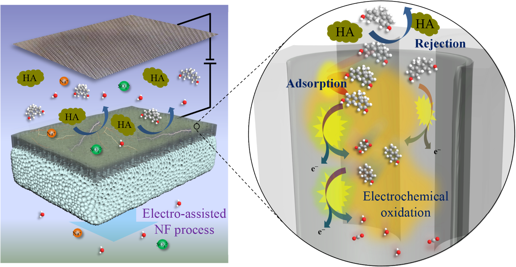 Nanofiltration (NF) has attracted increasing attention for wastewater treatment and potable water purification. However, the high-efficiency removal of micropollutants by NF membranes is a critical challenge. Owing to the adsorption and subsequent diffusion, some weakly charged or uncharged micropollutants, such as bisphenol A (BPA), can pass through NF membranes, resulting in low removal rates. Herein, an effective strategy is proposed to enhance the BPA removal efficiency of a crosslinked polyaniline/carbon nanotube NF membrane by coupling the membrane with electro-assistance. The membrane exhibited a 31.9% removal rate for 5 mg/L BPA with a permeance of 6.8 L/(m2·h·bar), while the removal rate was significantly improved to 98.1% after applying a voltage of 2.0 V to the membrane. Furthermore, when BPA coexisted with humic acid, the membrane maintained 94% removal of total organic carbon and nearly 100% removal of BPA at 2.0 V over the entire filtration period. Compared to continuous voltage applied to the membrane, an intermittent voltage (2.0 V for 0.5 h with an interval of 3.5 h) could achieve comparable BPA removal efficiency, because of the combined effect of membrane adsorption and subsequent electrochemical oxidation. Density functional theory calculations and BPA oxidation process analyses suggested that BPA was adsorbed by two main interactions: π–π and hydrogen-bond interactions. The adsorbed BPA was further electro-degraded into small organic acids or mineralized to CO2 and H2O. This work demonstrates that NF membranes coupled with electro-assistance are feasible for improving the removal of weakly charged or uncharged micropollutants.