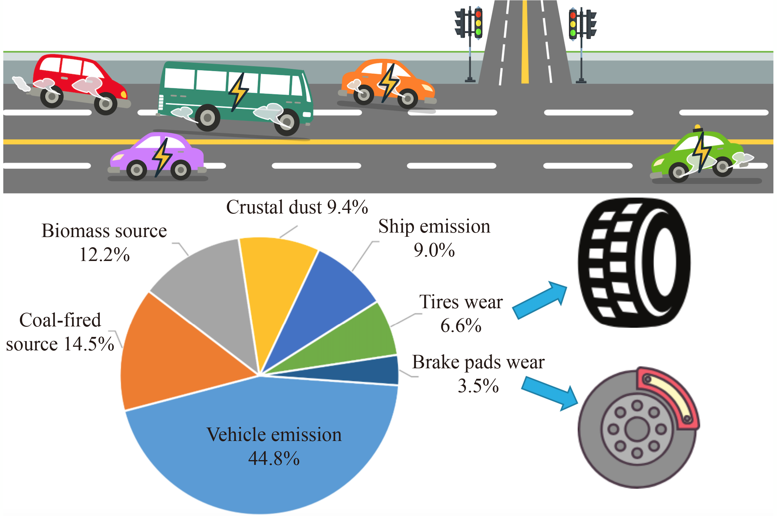 A single particle aerosol mass spectrometer (SPAMS) was used to accurately quantify the contribution of vehicle non-exhaust emissions to particulate matter at typical road environment. The PM2.5, black carbon, meteorological parameters and traffic flow were recorded during the test period. The daily trend for traffic flow and speed on TEDA Street showed obvious “M” and “W” characteristics. 6.3 million particles were captured via the SPAMS, including 1.3 million particles with positive and negative spectral map information. Heavy Metal, High molecular Organic Carbon, Organic Carbon, Mixed Carbon, Elemental Carbon, Rich Potassium, Levo-rotation Glucose, Rich Na, SiO3 and other categories were analyzed. The particle number concentration measured by SPAMS showed a good linear correlation with the mass concentrations of PM2.5 and BC, which indicates that the particulate matter captured by the SPAMS reflects the pollution level of fine particulate matter. EC, ECOC, OC, HM and crustal dust components were found to show high values from 7:00–9:00 AM, showing that these chemical components are directly or indirectly related to vehicle emissions. Based on the PMF model, 7 major factors are resolved. The relative contributions of each factor were determined: vehicle exhaust emission (44.8 %), coal-fired source (14.5 %), biomass combustion (12.2 %), crustal dust (9.4 %), ship emission (9.0 %), tires wear (6.6 %) and brake pads wear (3.5 %). The results show that the contribution of vehicle non-exhaust to particulate matter at roadside environment is approximately 10.1 %. Vehicle non-exhaust emissions are the focus of future research in the vehicle pollutant emission control field.