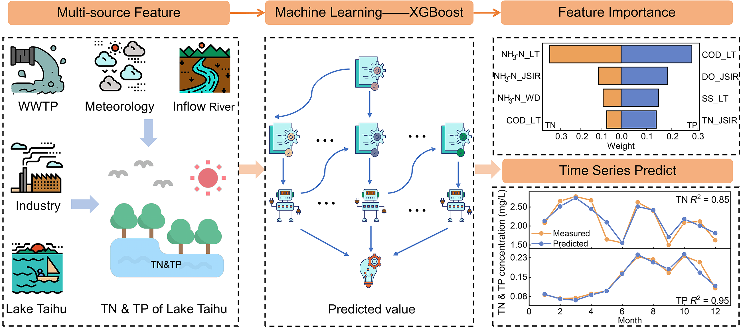 Effective control of lake eutrophication necessitates a full understanding of the complicated nitrogen and phosphorus pollution sources, for which mathematical modeling is commonly adopted. In contrast to the conventional knowledge-based models that usually perform poorly due to insufficient knowledge of pollutant geochemical cycling, we employed an ensemble machine learning (ML) model to identify the key nitrogen and phosphorus sources of lakes. Six ML models were developed based on 13 years of historical data of Lake Taihu’s water quality, environmental input, and meteorological conditions, among which the XGBoost model stood out as the best model for total nitrogen (TN) and total phosphorus (TP) prediction. The results suggest that the lake TN is mainly affected by the endogenous load and inflow river water quality, while the lake TP is predominantly from endogenous sources. The prediction of the lake TN and TP concentration changes in response to these key feature variations suggests that endogenous source control is a highly desirable option for lake eutrophication control. Finally, one-month-ahead prediction of lake TN and TP concentrations (R2 of 0.85 and 0.95, respectively) was achieved based on this model with sliding time window lengths of 9 and 6 months, respectively. Our work demonstrates the great potential of using ensemble ML models for lake pollution source tracking and prediction, which may provide valuable references for early warning and rational control of lake eutrophication.