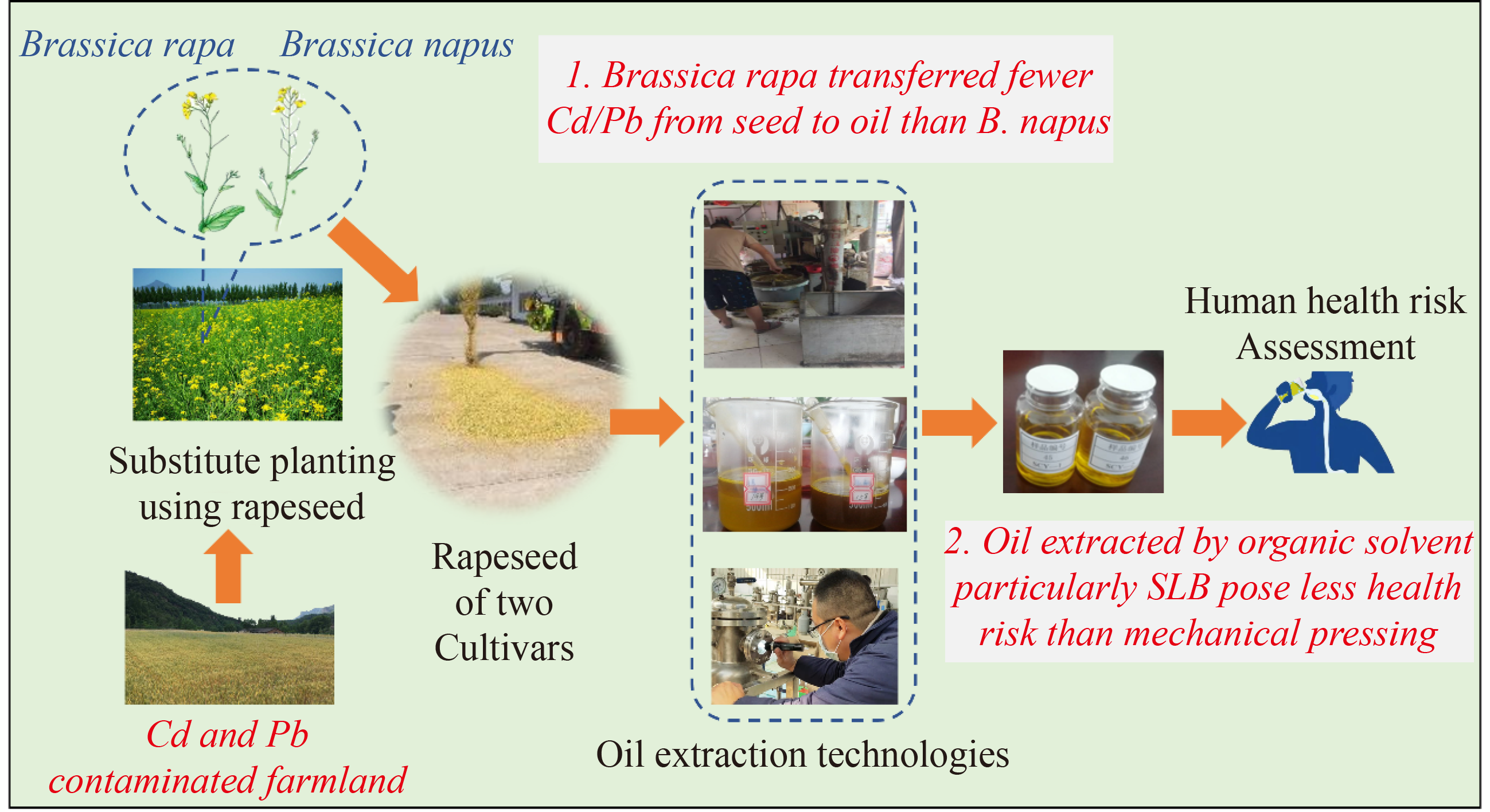 Substitute planting with rapeseed offers promise for safely using large areas of Cd/Pb-contaminated farmland. Cd/Pb distributions during rapeseed oil production were investigated and health risks posed by the oil were assessed. Tests were performed using three cultivars (Brassica rapa SYH and ZS100 and Brassica napus QY-1) and four oil extraction techniques (mechanical and low-temperature pressing and n-hexane and subcritical low-temperature butane extraction). The amounts of Cd and Pb in oil were 0.73%–8.44% and 3.14%–11.76%, respectively, of the amounts in rapeseed and were strongly affected by the cultivar and oil extraction technique. The heavy metal (HM) concentrations were lower in solvent-extracted oil (particularly subcritical low-temperature butane extracted oil, in which HMs were not detected) than mechanically pressed oil. The Cd and Pb transfer indices were lower (meaning larger proportions of HMs were retained by the rapeseed meal) for B. rapa than B. napus. This was attributed to a high HM binding protein content of B. rapa seed. Health risks to humans were assessed using a probabilistic risk assessment model. The carcinogenic risk was mainly (97.1%–99.9%) caused by Cd and poses more concern than non-carcinogenic risk. Stronger health risks are posed by mechanically pressed than solvent-extracted oil, and higher carcinogenic risks are posed to people living in rural areas than urban areas. Substitute planting with B. rapa and extracting oil with organic solvent (preferably subcritical low-temperature butane) are optimal for safely utilizing Cd/Pb-contaminated soil. Attention should be paid to the health risks posed by Cd in oil to rural populations.