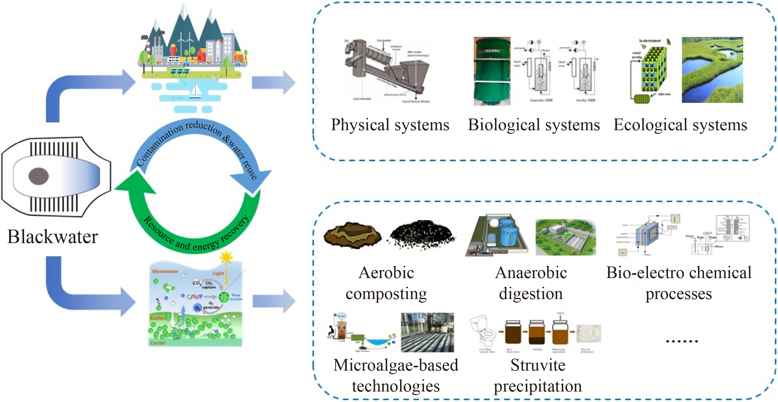 Blackwater (BW), consisting of feces, urine, flushing water and toilet paper, makes up an important portion of domestic wastewater. The improper disposal of BW may lead to environmental pollution and disease transmission, threatening the sustainable development of the world. Rich in nutrients and organic matter, BW could be treated for resource recovery and reuse through various approaches. Aimed at providing guidance for the future development of BW treatment and resource recovery, this paper presented a literature review of BWs produced in different countries and types of toilets, including their physiochemical characteristics, and current treatment and resource recovery strategies. The degradation and utilization of carbon (C), nitrogen (N) and phosphorus (P) within BW are underlined. The performance of different systems was classified and summarized. Among all the treating systems, biological and ecological systems have been long and widely applied for BW treatment, showing their universality and operability in nutrients and energy recovery, but they are either slow or ineffective in removal of some refractory pollutants. Novel processes, especially advanced oxidation processes (AOPs), are becoming increasingly extensively studied in BW treatment because of their high efficiency, especially for the removal of micropollutants and pathogens. This review could serve as an instructive guidance for the design and optimization of BW treatment technologies, aiming to help in the fulfilment of sustainable human excreta management.