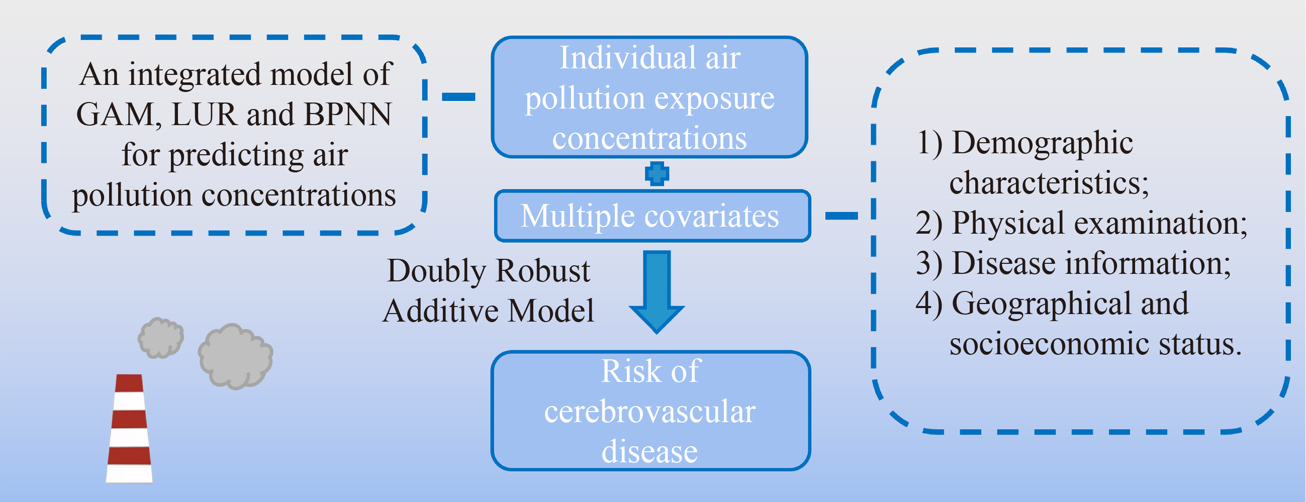 ● This study explored the long-term association by double robust additive models. ● Individual exposure concentrations were assessed by integrating GAM, LUR and BPNN. ● PM2.5, SO2 and NO2 are positively associated with cerebrovascular disease. ● CO could reduce the risk of cerebrovascular disease with the highest robustness. ● The elderly, women and people with normal BMI are at higher risk for air pollution.