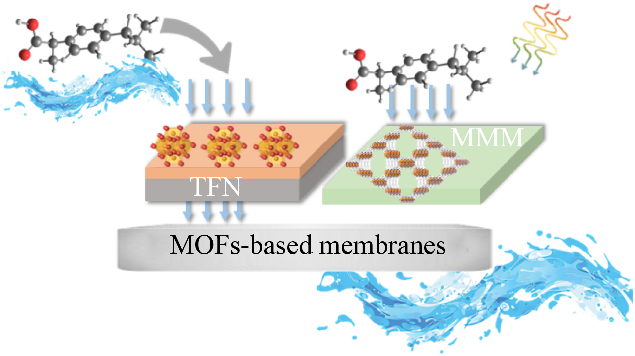 Presence of emerging organic contaminants (EOCs) in water is one of the major threats to water safety. In recent decades, an increasing number of studies have investigated new approaches for their effective removal. Among them, metal-organic frameworks (MOFs) have attracted increasing attention since their first development thanks to their tunable metal nodes and versatile, functional linkers. However, whether or not MOFs have a promising future for practical application in emerging contaminants-containing wastewater is debatable. This review summarizes recent studies about the removal of EOCs using MOFs-related material. The synthesis strategies of both MOF particles and composites, including thin-film nanocomposite and mixed matrix membranes, are critically reviewed, as well as various characterization technologies. The application of the MOF-based composite membranes in adsorption, separation (nanofiltration and ultrafiltration), and catalytic degradation are discussed. Overall, literature survey shows that MOFs-based composite could play a crucial role in eliminating EOCs in the future. In particular, modified membranes that realize separation and degradation might be the most promising materials for such application.