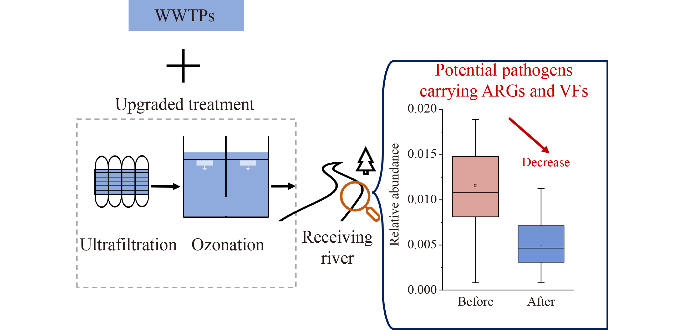 Wastewater treatment plants (WWTPs) with additional tertiary ultrafiltration membranes and ozonation treatment can improve water quality in receiving rivers. However, the impacts of WWTP upgrade (WWTP-UP) on pathogens carrying antibiotic resistance genes (ARGs) and virulence factors (VFs) in rivers remain poorly understood. In this study, ARGs, VFs, and their pathogenic hosts were investigated in three rivers impacted by large-scale WWTP-UP. A five-year sampling campaign covered the periods before and after WWTP-UP. Results showed that the abundance of total metagenome-assembled genomes (MAGs) containing both ARGs and VFs in receiving rivers did not decrease substantially after WWTP-UP, but the abundance of MAGs belonging to pathogenic genera that contain both ARGs and VFs (abbreviated as PAVs) declined markedly. Genome-resolved metagenomics further revealed that WWTP-UP not only reduced most types of VFs and ARGs in PAVs, but also effectively eliminated efflux pump and nutritional VFs carried by PAVs in receiving rivers. WWTP-UP narrowed the pathogenic host ranges of ARGs and VFs and mitigated the co-occurrence of ARGs and VFs in receiving rivers. These findings underline the importance of WWTP-UP for the alleviation of pathogens containing both ARGs and VFs in receiving rivers.