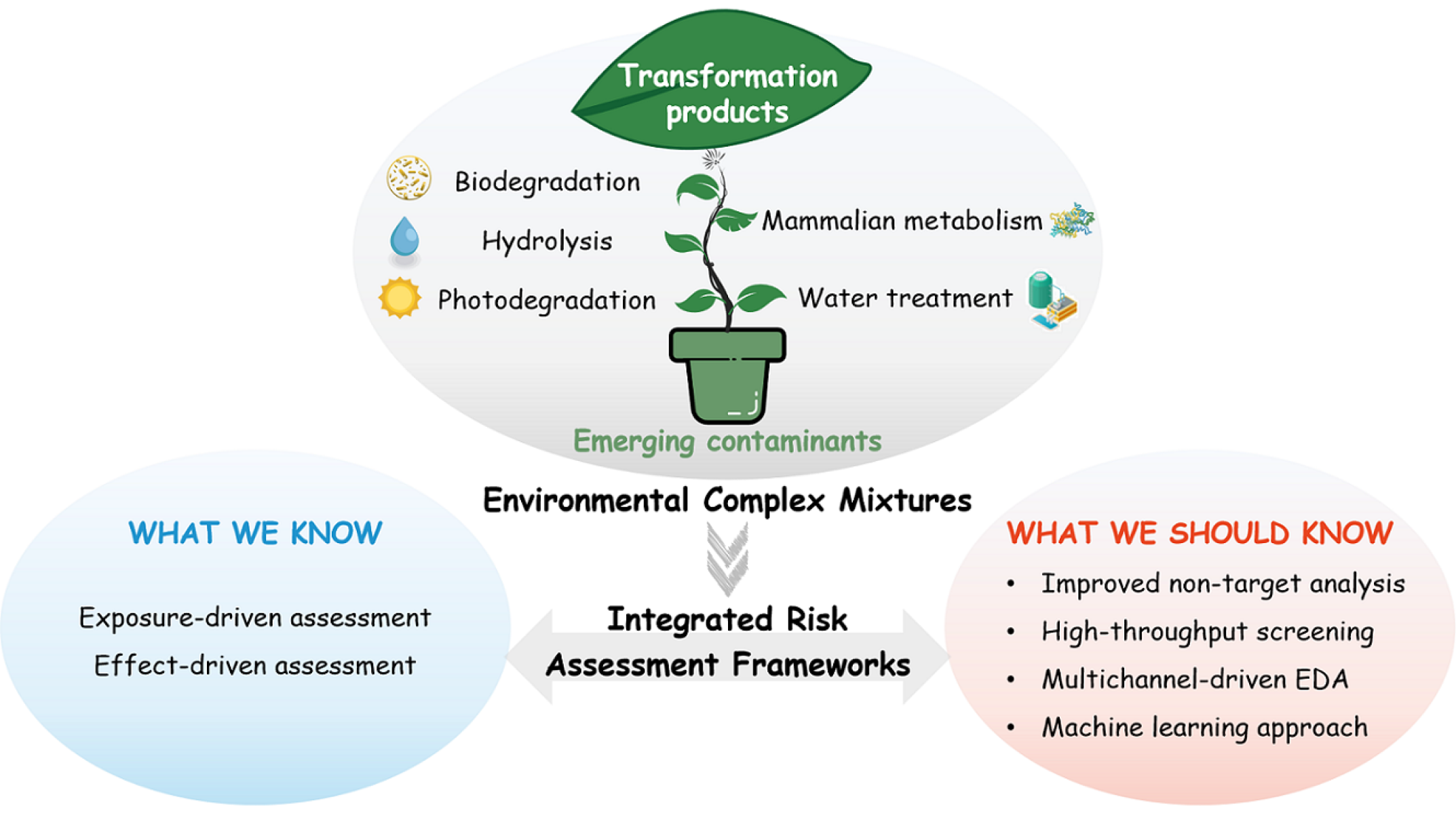 The continuous input of various emerging contaminants (ECs) has inevitably introduced large amounts of transformation products (TPs) in natural and engineering water scenarios. Structurally similar to the precursor species, the TPs are expected to possess comparative, if not more serious, environmental properties and risks. This review summarizes the state-of-the-art knowledge regarding the integrated risk assessment frameworks of TPs of ECs, mainly involving the exposure- and effect-driven analysis. The inadequate information within existing frameworks that was essential and critical for developing a better risk assessment framework was discussed. The main strategic improvements include (1) non-targeted product analysis in both laboratory and field samples, (2) omics-based high-throughput toxicity assessment, (3) multichannel-driven mode of action in conjugation with effect-directed analysis, and (4) machine learning technology. Overall, this review provides a concise but comprehensive insight into the optimized strategy for evaluating the environmental risks and screening the key toxic products from the cocktail mixtures of ECs and their TPs in the global water cycle. This facilitates deciphering the mode of toxicity in complex chemical mixtures and prioritizing the regulated TPs among the unknown products, which have the potential to be considered a class of novel “ECs” of great concern.