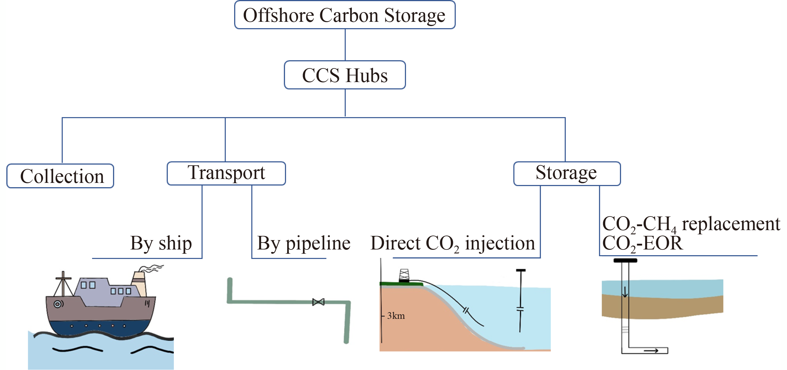 ● The main direct seal up carbon options and challenges are reviewed. ● Ocean-based CO2 replacement for CH4/oil exploitation is presented. ● Scale-advantage of offshore CCS hub is discussed.