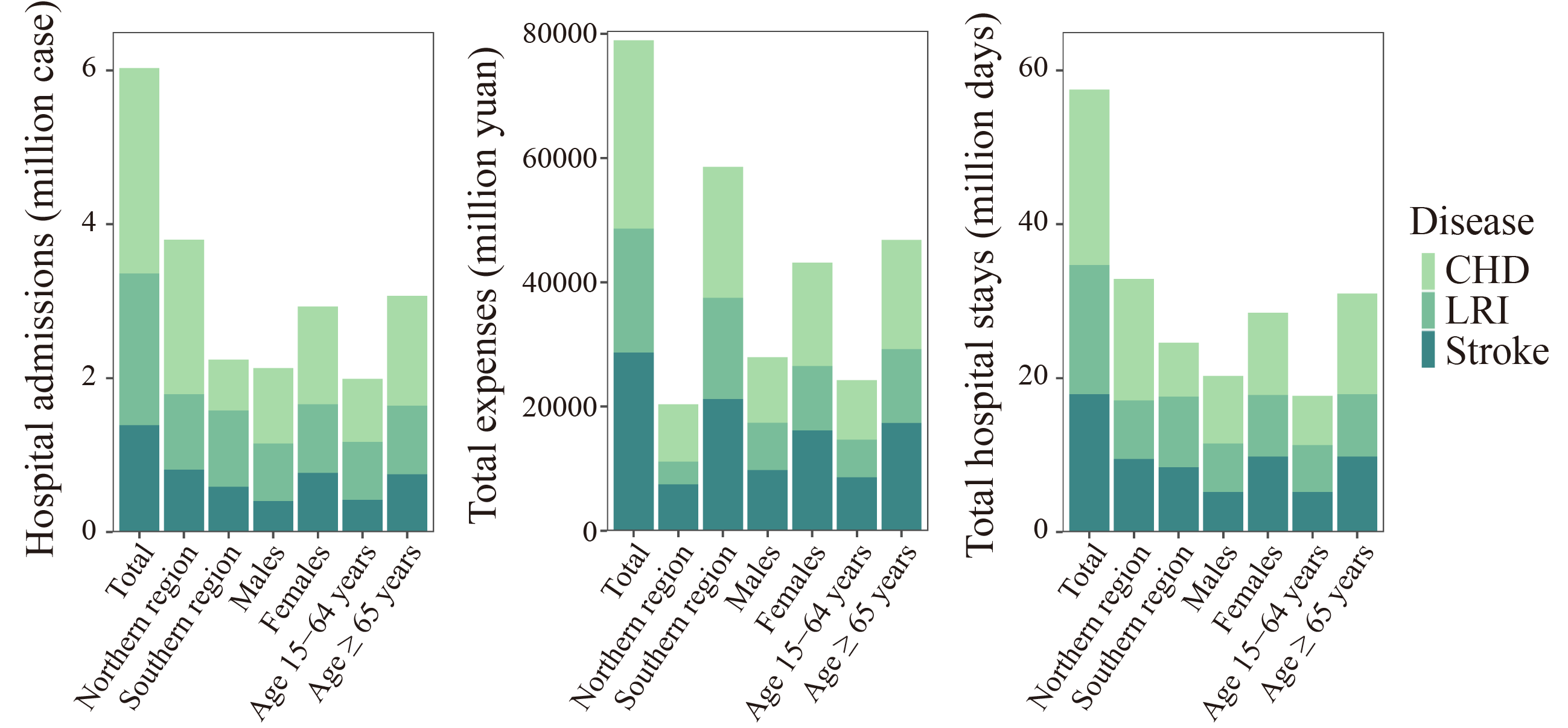 ● Monthly hospitalization expenses are sensitive to increases in PM2.5 exposure. ● The increased PM2.5 causes patients with CHD and LRI to stay longer in the hospital. ● The impact of PM2.5 on total expenses for stroke is greater in southern China. ● Males may be more sensitive to air pollution than females.