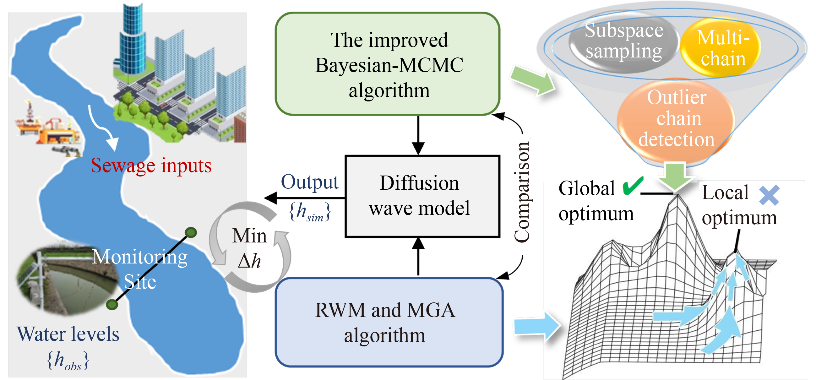 Water quality restoration in rivers requires identification of the locations and discharges of pollution sources, and a reliable mathematical model to accomplish this identification is essential. In this paper, an innovative framework is presented to inversely estimate pollution sources for both accident preparedness and normal management of the allowable pollutant discharge. The proposed model integrates the concepts of the hydrodynamic diffusion wave equation and an improved Bayesian-Markov chain Monte Carlo method (MCMC). The methodological framework is tested using a designed case of a sudden wastewater spill incident (i.e., source location, flow rate, and starting and ending times of the discharge) and a real case of multiple sewage inputs into a river (i.e., locations and daily flows of sewage sources). The proposed modeling based on the improved Bayesian-MCMC method can effectively solve high-dimensional search and optimization problems according to known river water levels at pre-set monitoring sites. It can adequately provide accurate source estimation parameters using only one simulation through exploration of the full parameter space. In comparison, the inverse models based on the popular random walk Metropolis (RWM) algorithm and microbial genetic algorithm (MGA) do not produce reliable estimates for the two scenarios even after multiple simulation runs, and they fall into locally optimal solutions. Since much more water level data are available than water quality data, the proposed approach also provides a cost-effective solution for identifying pollution sources in rivers with the support of high-frequency water level data, especially for rivers receiving significant sewage discharges.