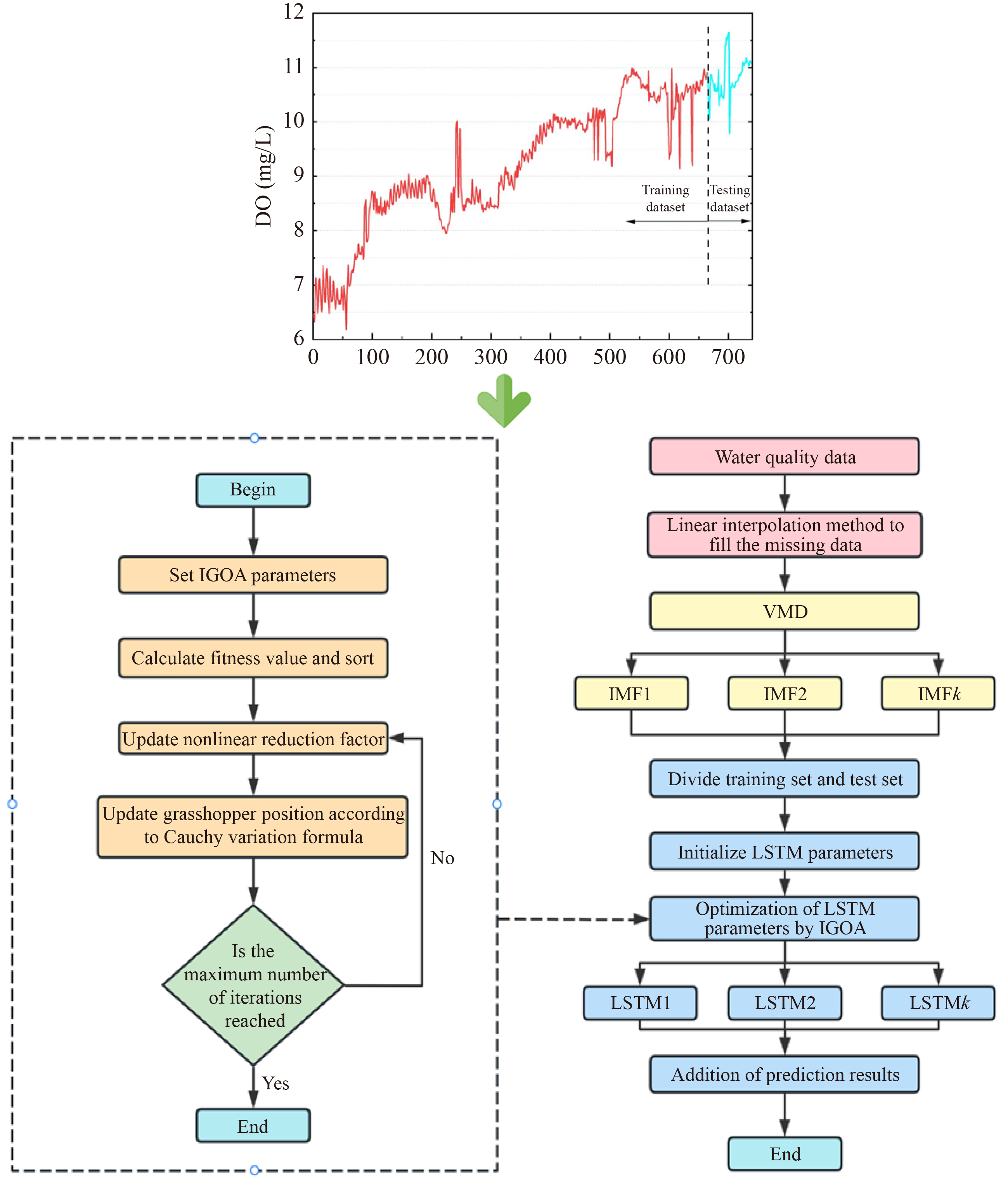 ● A novel VMD-IGOA-LSTM model has proposed for the prediction of water quality. ● Improved model quickly converges to the global optimal fitness and remains stable. ● The prediction accuracy of water quality parameters is significantly improved.