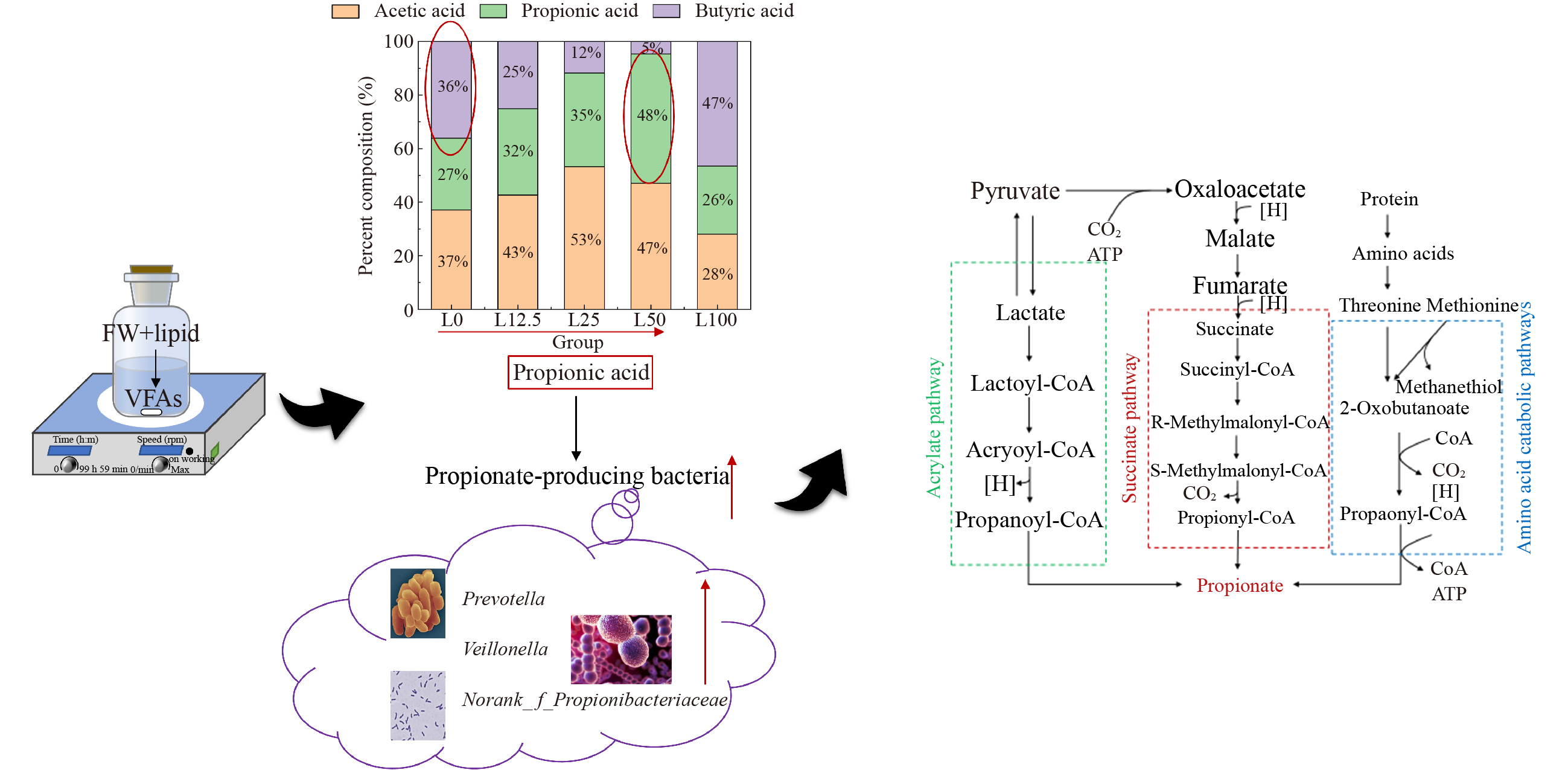 Food waste (FW) is a promising renewable low-cost biomass substrate for enhancing the economic feasibility of fermentative propionate production. Although lipids, a common component of food waste, can be used as a carbon source to enhance the production of volatile fatty acids (VFAs) during co-fermentation, few studies have evaluated the potential for directional propionate production from the co-fermentation of lipids and FW. In this study, co-fermentation experiments were conducted using different combinations of lipids and FW for VFA production. The contributions of lipids and FW to propionate production, hydrolysis of substrates, and microbial composition during co-fermentation were evaluated. The results revealed that lipids shifted the fermentation type of FW from butyric to propionic acid fermentation. Based on the estimated propionate production kinetic parameters, the maximum propionate productivity increased significantly with an increase in lipid content, reaching 6.23 g propionate/(L∙d) at a lipid content of 50%. Propionate-producing bacteria Prevotella, Veillonella, and norank_f_Propionibacteriaceae were enriched in the presence of lipids, and the succinate pathway was identified as a prominent fermentation route for propionate production. Moreover, the Kyoto Encyclopedia of Genes and Genomes functional annotation revealed that the expression of functional genes associated with amino acid metabolism was enhanced by the presence of lipids. Collectively, these findings will contribute to gaining a better understanding of targeted propionate production from FW.