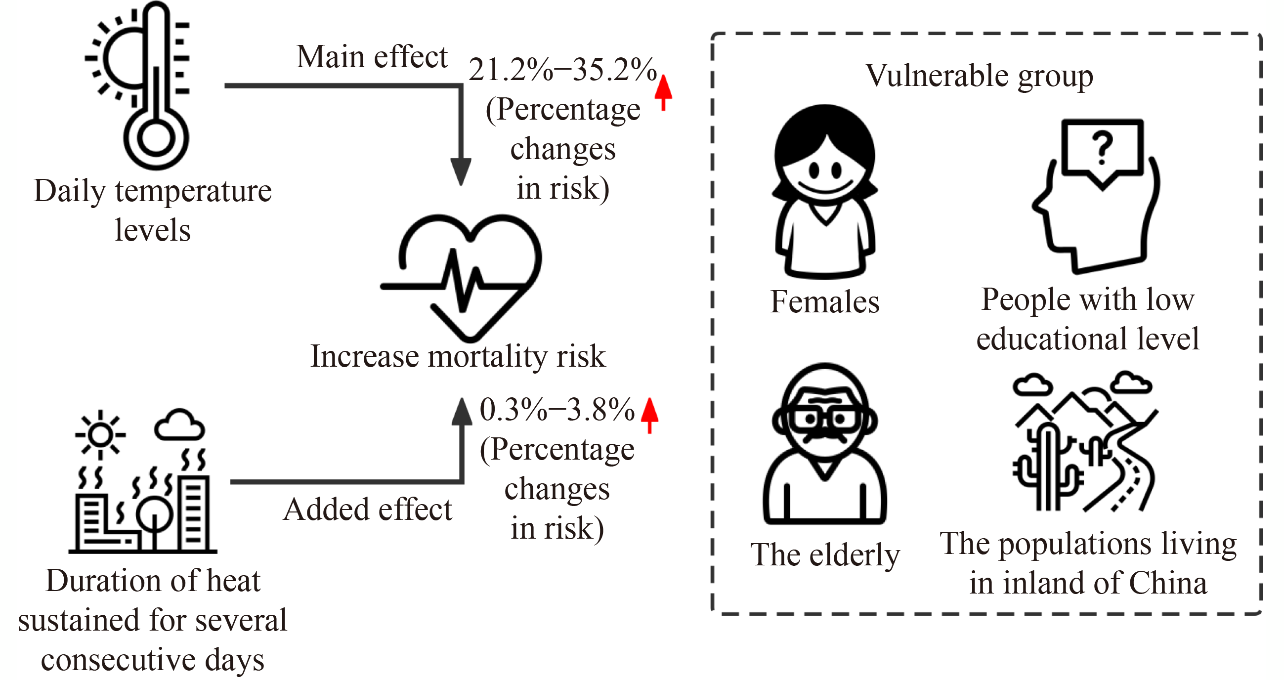 ● The main and added effect from heat co-existed in China. ● Both of the main and added effect could increase the mortality risk of population. ● Females, the elderly, the less educated and inland residents were more vulnerable.