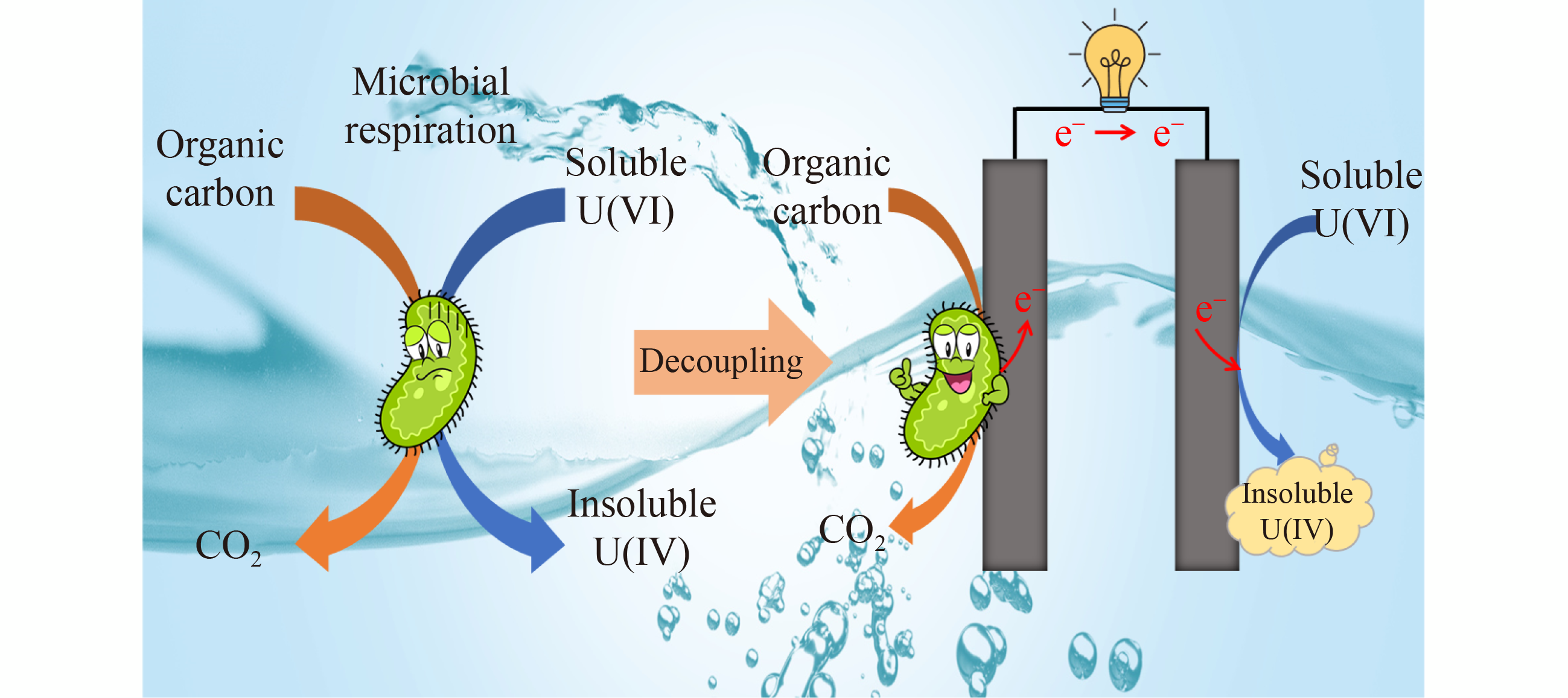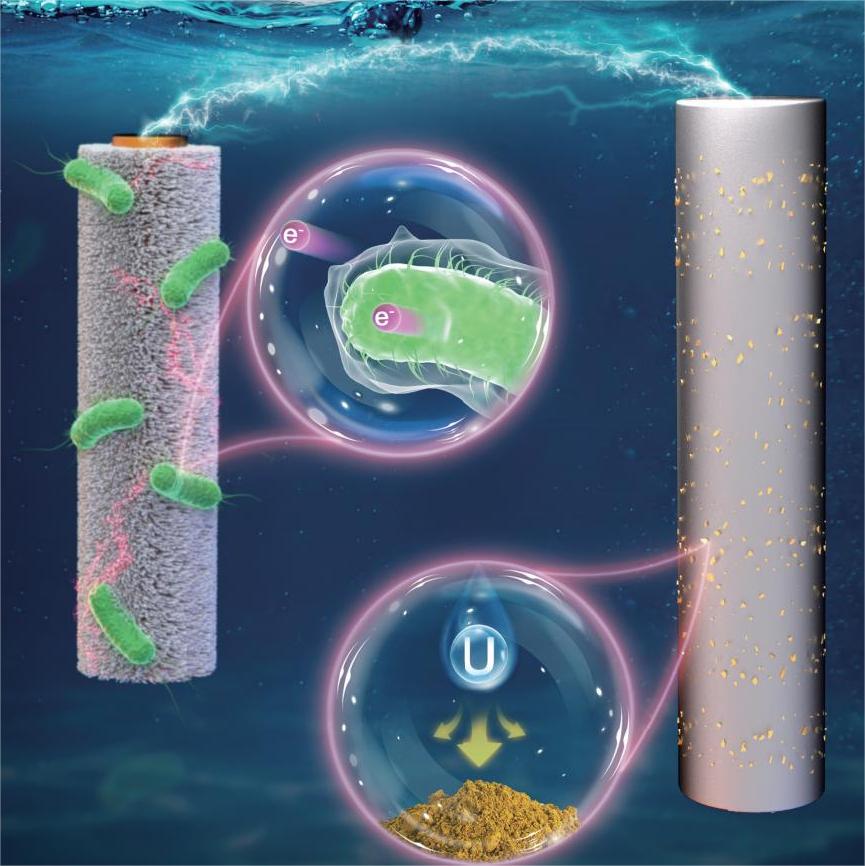 The extraction of uranium (U) from U-bearing wastewater is of paramount importance for mitigating negative environmental impacts and recovering U resources. Microbial reduction of soluble hexavalent uranium (U(VI)) to insoluble tetravalent uranium (U(IV)) holds immense potential for this purpose, but its practical application has been impeded by the challenges associated with managing U-bacterial mixtures and the biotoxicity of U. To address these challenges, we present a novel spontaneous microbial electrochemical (SMEC) method that spatially decoupled the microbial oxidation reaction and the U(VI) reduction reaction. Our results demonstrated stable and efficient U extraction with net electrical energy production, which was achieved with both synthetic and real wastewater. U(VI) removal occurred via diffusion-controlled U(VI)-to-U(IV) reduction-precipitation at the cathode, and the UIVO2 deposited on the surface of the cathode contributed to the stability and durability of the abiotic U(VI) reduction. Metagenomic sequencing revealed the formation of efficient electroactive communities on the anodic biofilm and enrichment of the key functional genes and metabolic pathways involved in electron transfer, energy metabolism, the TCA cycle, and acetate metabolism, which indicated the ectopic reduction of U(VI) at the cathode. Our study represents a significant advancement in the cost-effective recovery of U from U(VI)-bearing wastewater and may open a new avenue for sustainable uranium extraction.
