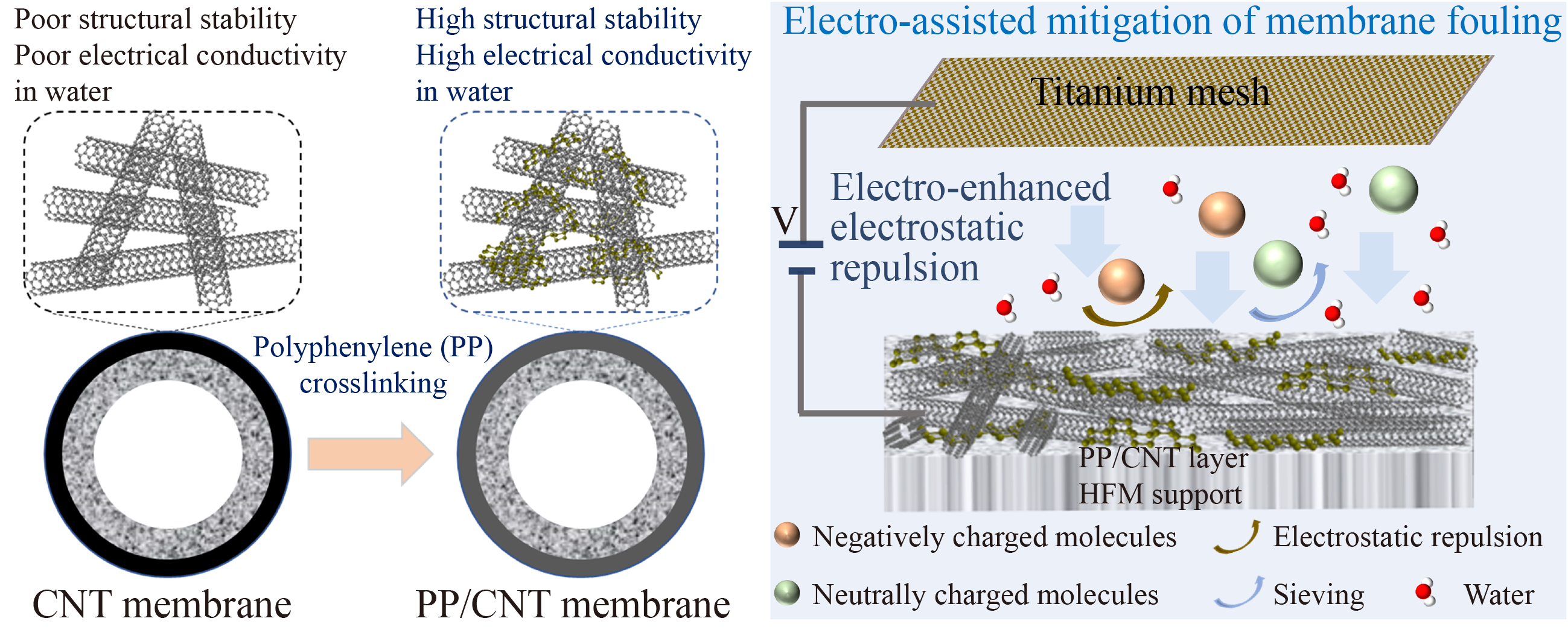 Nanocarbon-based conductive membranes, especially carbon nanotube (CNT)-based membranes, have tremendous potential for wastewater treatment and water purification because of their excellent water permeability and selectivity, as well as their electrochemically enhanced performance (e.g., improved antifouling ability). However, it remains challenging to prepare CNT membranes with high structural stability and high electrical conductivity. In this study, a highly electroconductive and structurally stable polyphenylene/CNT (PP/CNT) composite membrane was prepared by electropolymerizing biphenyl on a CNT hollow fiber membrane. The PP/CNT membrane showed 3.4 and 5.0 times higher electrical conductivity than pure CNT and poly(vinyl alcohol)/CNT (PVA/CNT) membranes, respectively. The structural stability of the membrane was superior to that of the pure CNT membrane and comparable to that of the PVA/CNT membrane. The membrane fouling was significantly alleviated under an electrical assistance of −2.0 V, with a flux loss of only 11.7% after 5 h filtration of humic acid, which is significantly lower than those of PP/CNT membranes without electro-assistance (56.8%) and commercial polyvinylidene fluoride (PVDF) membranes (64.1%). Additionally, the rejection of negatively charged pollutants (humic acid and sodium alginate) was improved by the enhanced electrostatic repulsion. After four consecutive filtration-cleaning cycle tests, the flux recovery rate after backwashing reached 97.2%, which was much higher than those of electricity-free PP/CNT membranes (67.0%) and commercial PVDF membranes (61.1%). This study offers insights into the preparation of stable conductive membranes for membrane fouling control in potential water treatment applications.