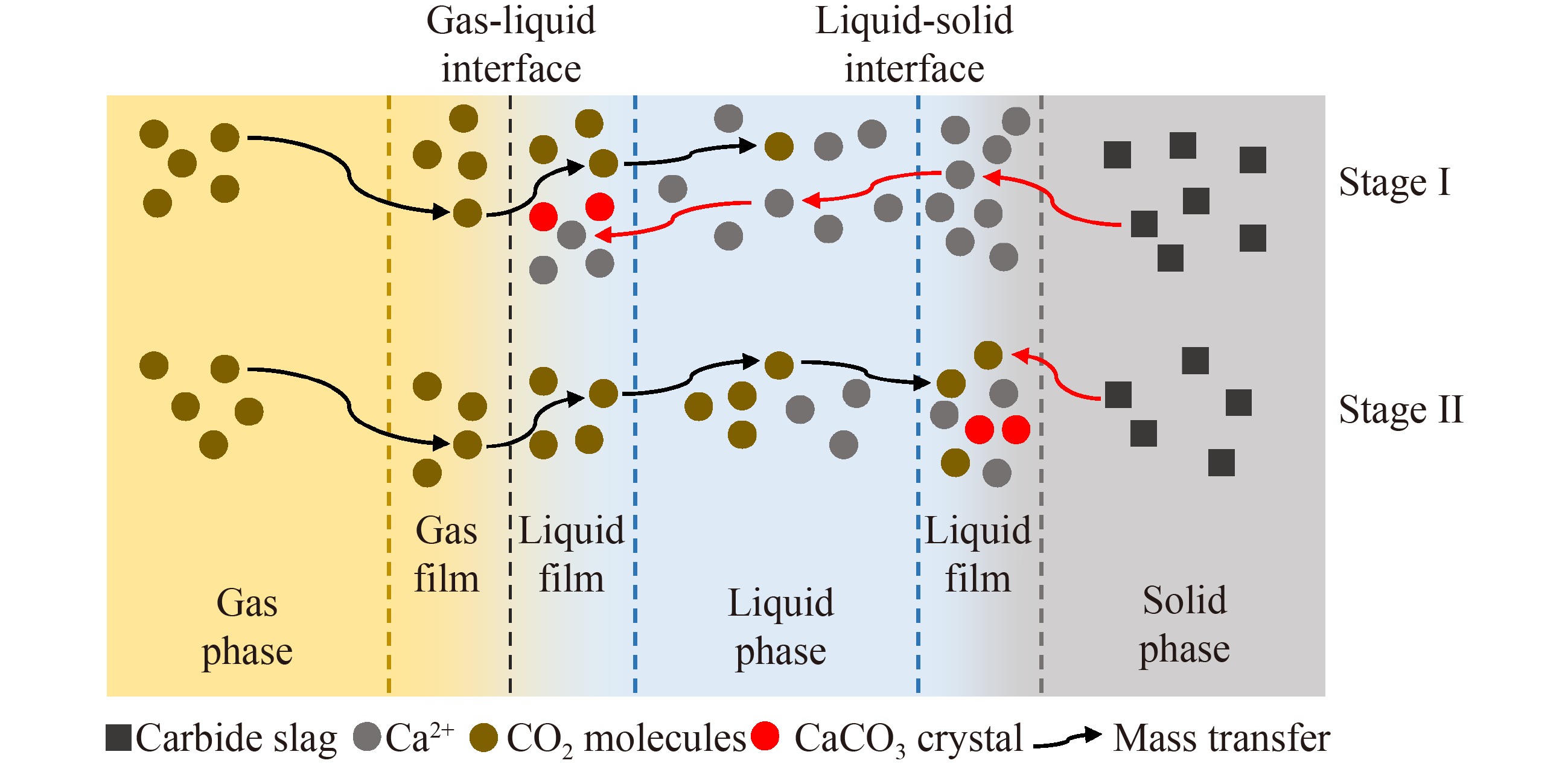 ● The sequestration capacity of 610.8 g CO2/kg was achieved for carbide slag. ● Corresponding carbonation efficiency was 62.04% at optimum reaction conditions. ● The mass transfer of CO2 was the rate-limiting steps at the initial stage. ● The mass transfer of Ca2+ controlled the carbonation rate with increasing time.