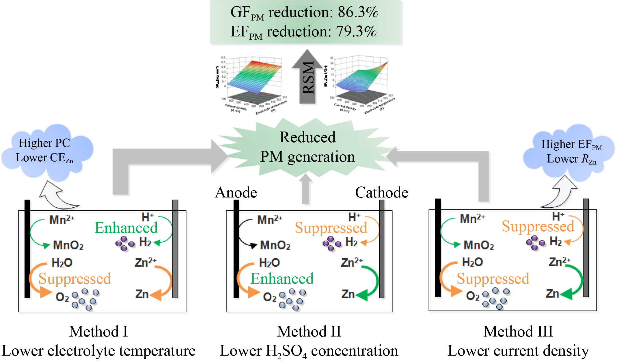 Heavy particulate matter (PM) pollution and high energy consumption are the bottlenecks of hydrometallurgy, especially in the electrolysis process. Therefore, an urgent need is to explore PM reduction methods with production performance co-benefits. This study presents three PM reduction methods based on controlling operating parameters, i.e., lowering electrolyte temperature, H2SO4 concentration, and current density of the cathode. The optimized conditions were also investigated using the response surface methodology to balance the PM reduction effect and Zn production. The results showed that lowering electrolyte temperature is the most efficient, with an 89.0% reduction in the PM generation flux (GFPM). Reducing H2SO4 concentration led to the minimum side effects on the current efficiency of Zn deposition (CEZn) or power consumption (PC). With the premise of non-deteriorating CEZn and PC, GFPM can be reduced by 86.3% at the optimal condition (electrolyte temperature = 295 K, H2SO4 = 110 g/L, current density = 373 A/m2). In addition, the reduction mechanism was elucidated by comprehensively analyzing bubble characteristics, electrochemical reactions, and surface tension. Results showed that lower electrolyte temperature inhibited the oxygen evolution reaction (OER) and compressed gas volume. Lower H2SO4 concentration inhibited the hydrogen evolution reaction (HER) and reduced electrolyte surface tension. Lower current density inhibited both OER and HER by decreasing the reaction current. The inhibited gas evolutions reduced the microbubbles’ number and size, thereby reducing GFPM. These results may provide energy-efficient PM reduction methods and theoretical hints of exploring cleaner PM reduction approaches for industrial electrolysis.