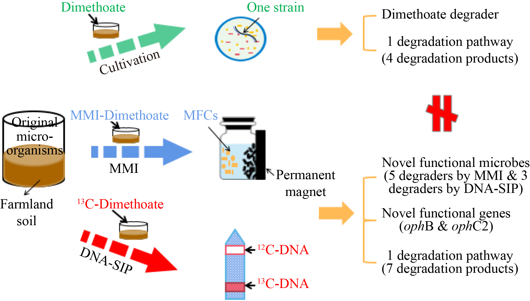 ● Dimethoate degraders were identified via MMI and DNA-SIP. ● MMI identified Pseudomonas, Bacillus, Ramlibacter, Arthrobacter , and Rhodococcus. ● DNA-SIP identified Ramlibacter , Rhodococcus and Arthrobacter. ● Both oph B and oph C2 were involved in dimethoate metabolism. ● MMI shows higher resolution than DNA-SIP in identifying functional microbes.